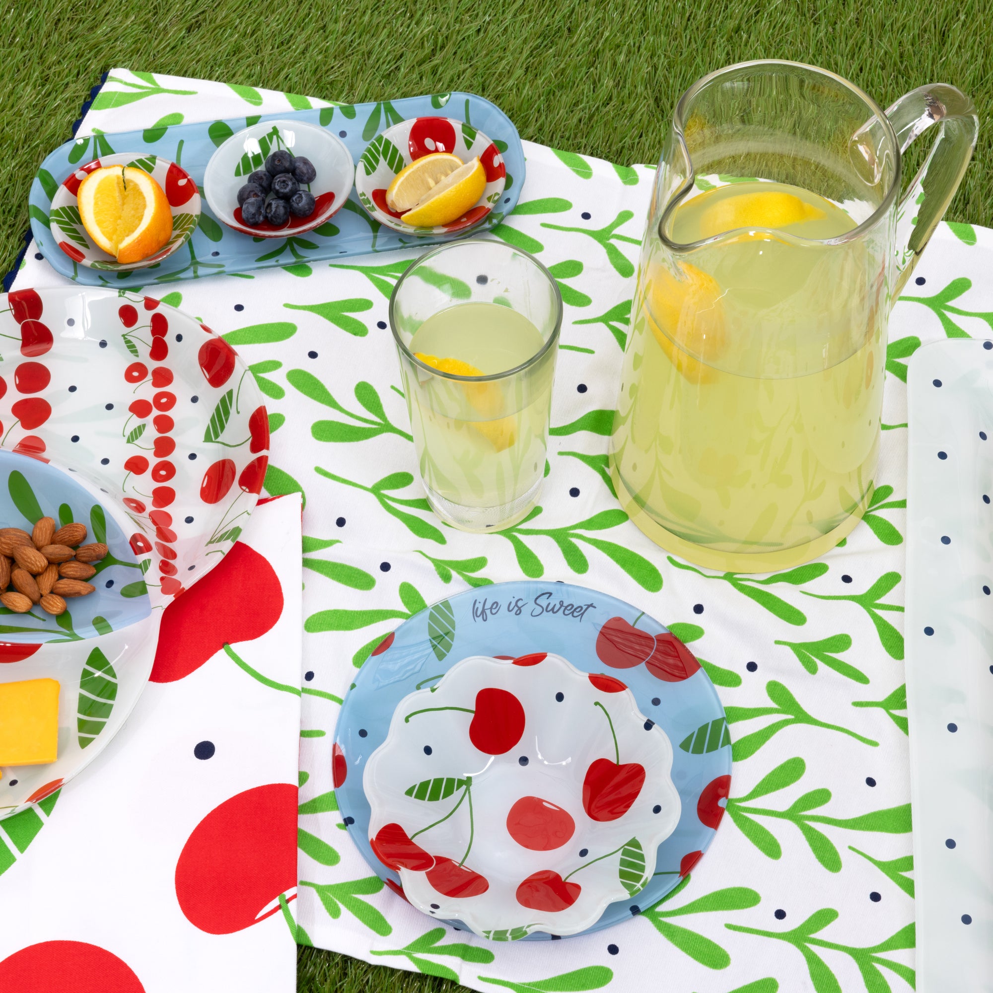 - IN-HOUSE DESIGN: All of the bowls have a white background. One bowl has a stemmed pair of cherries, and the other two bowls have a matching leaf and cherry design. The tray has a blue background, polka dots, and greenery.