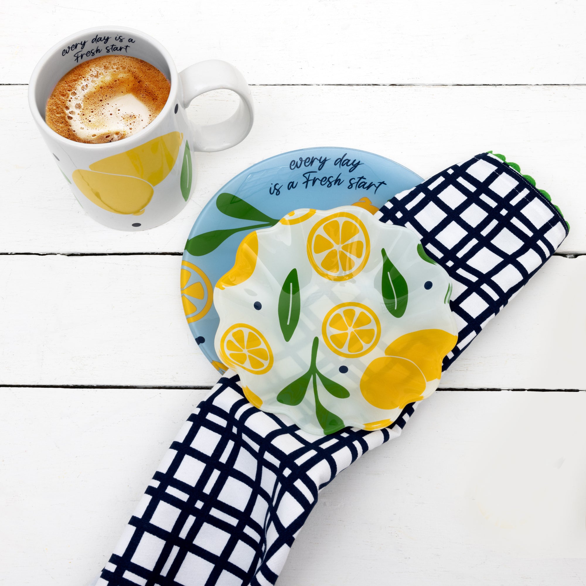 - IN-HOUSE DESIGN: Large bold whole and halved lemons are accompanied by greenery and blue polka dots on a white background.