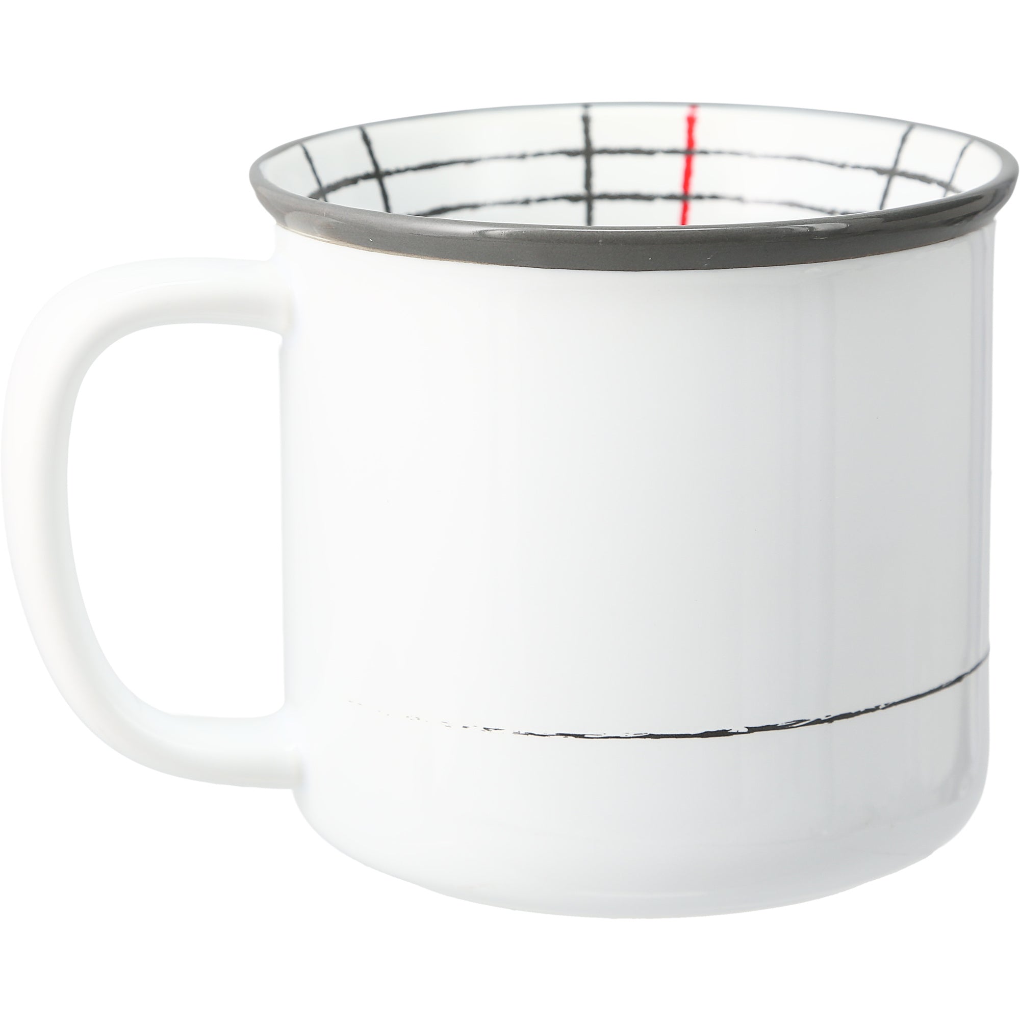- IN-HOUSE DESIGN: The mug's front features a sitting dog silhouette. To the left is a sentiment: "Dogs Make Me Happy." The lip of the white cup's interior has a crayon-looking white & red checkered pattern interior wrap-around finish.