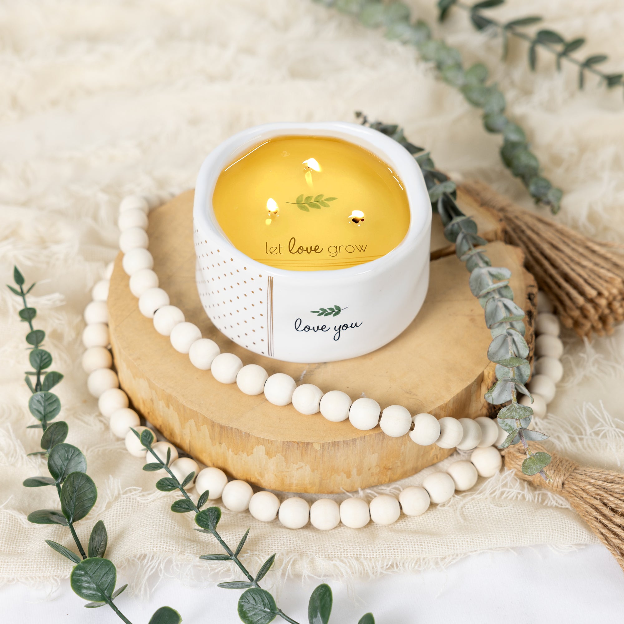 - IN-HOUSE DESIGN: The new & innovative candle offers a unique message for your loved one within the wax as time progresses. You will see cursive written "Let Love Grow" sentiment after about 10 minutes. As you watch, the entire decal with an intertwining golden triple-string and leaf design will appear after 60 minutes. Then, the message will hide again and reappear with each burn. The front of the candles has a simplistic "Love You" decal accompanied by leaf and metallic gold polka dot wrap-around patterns on a matte white exterior handmade feel vessel with a glossy interior.