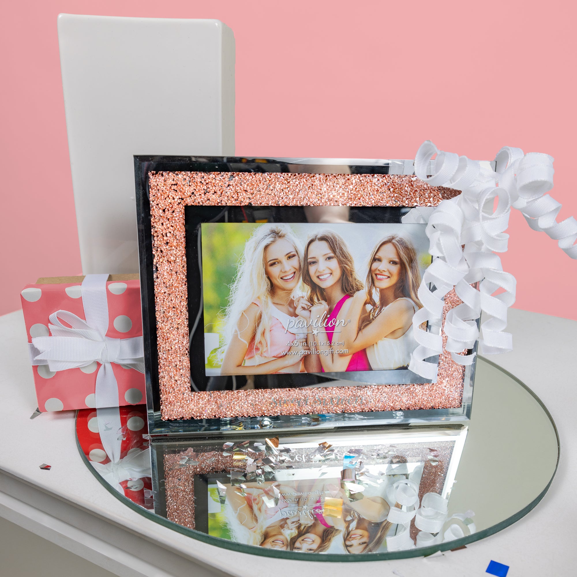 - PREMIUM QUALITY: 9.25” x 7.25" frame is constructed with an electroplated mirrored edge & frame around the photograph. Plastic beads are encased between the backing and glass front. The thick cardboard backing consists of two plastic turn knobs, a fold-out easel for display, and fold-down features for the 4” x 6” horizontal photo replacement.