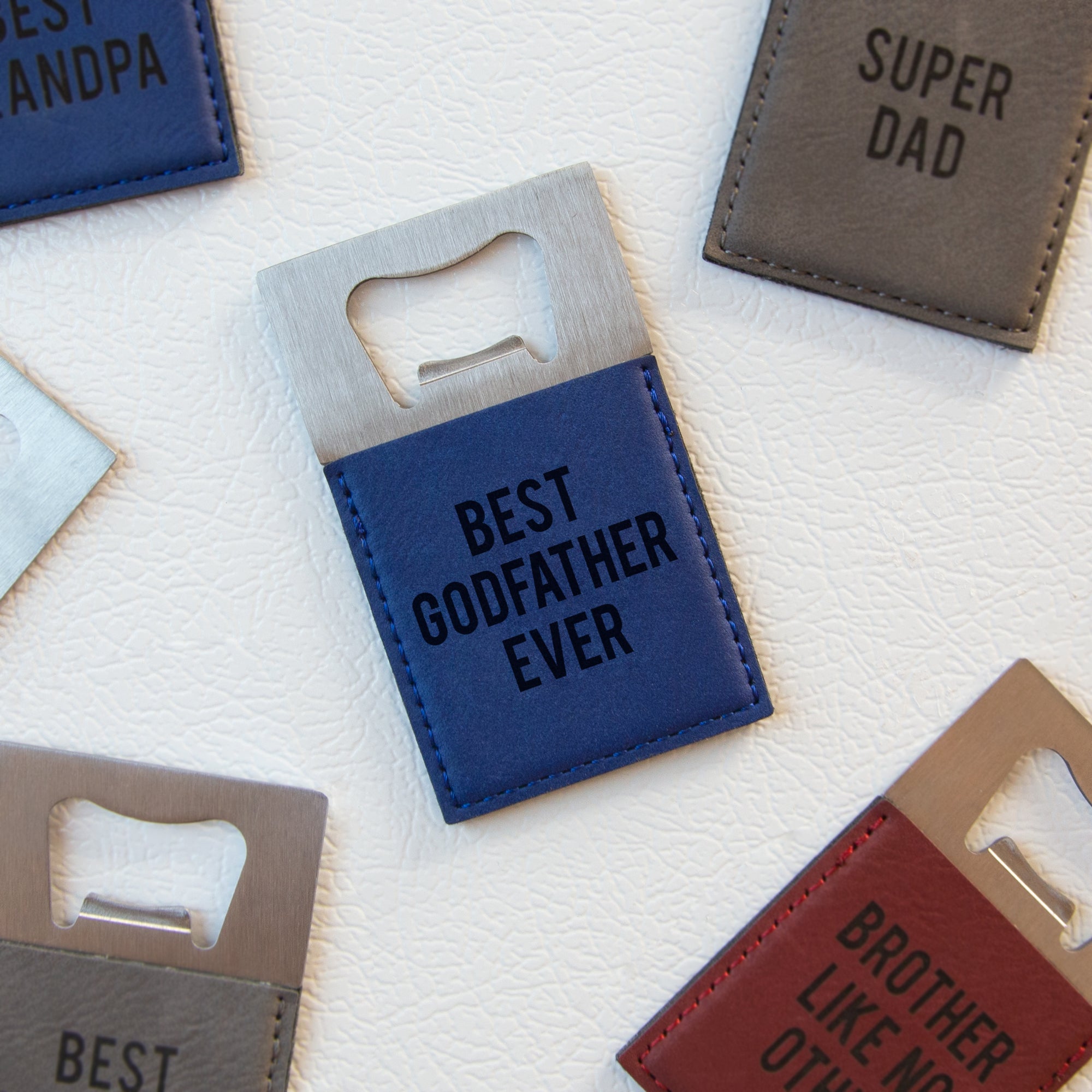 • IN-HOUSE DESIGN: "Best Godfather Ever" text is laser-printed onto the front of the bottle opener.