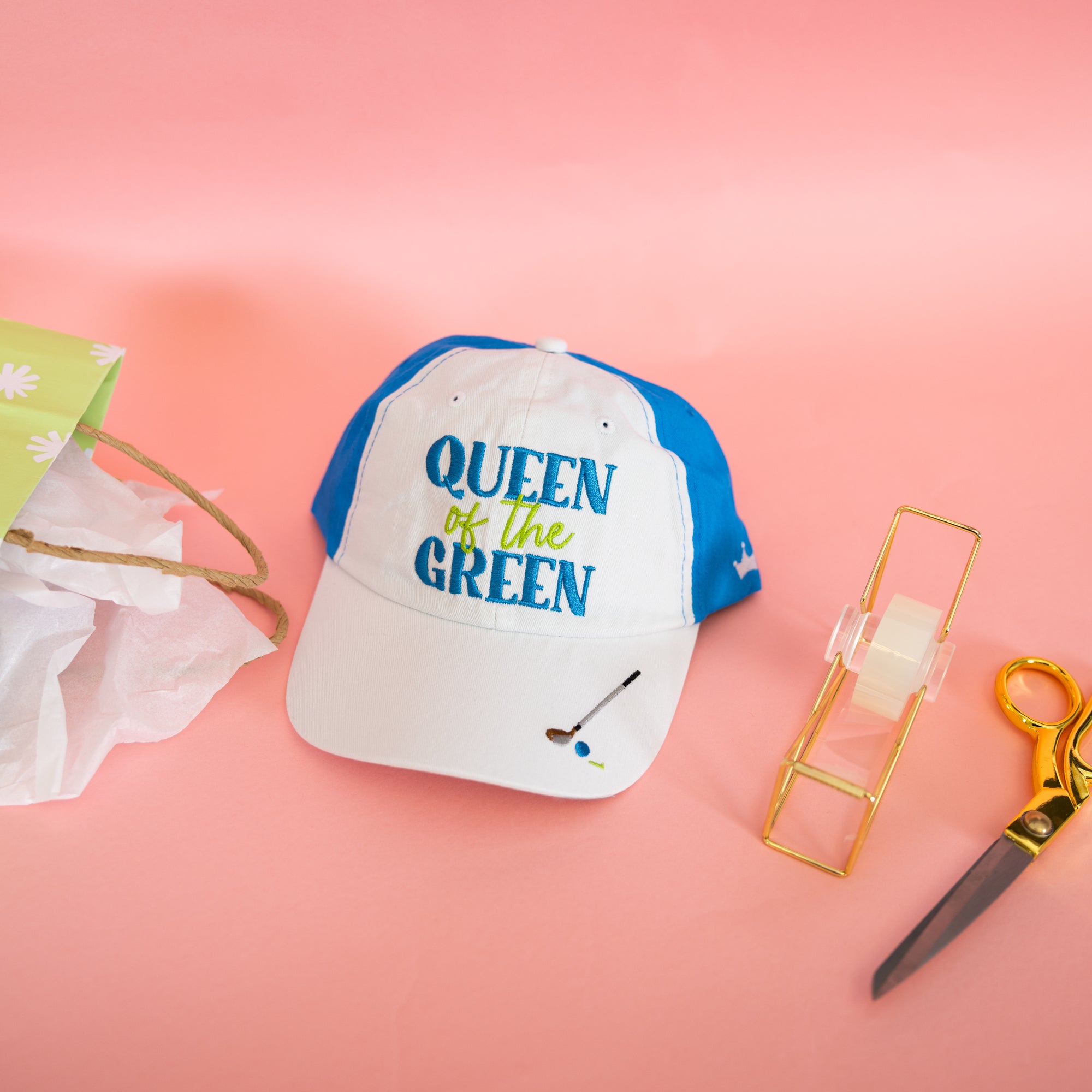 - IN-HOUSE DESIGN: Our baseball hats are designed with small holes in the top of each hat section, allowing for better breathability and comfort during hot days on the golf course. The brim of the hat can be easily bent to your preferred arch, providing customizable sun protection. The snap backing includes an adjustable strap that can be conveniently tucked away into the backside of the hat. On the front, you'll find an embroidered patch with the green and teal sentiment "Queen Of The Green," while the brim features embroidered images of a driver, golf ball, and tee. The front two panels and brim are crisp white, creating a striking contrast with the rest of the hat in a vibrant teal color.