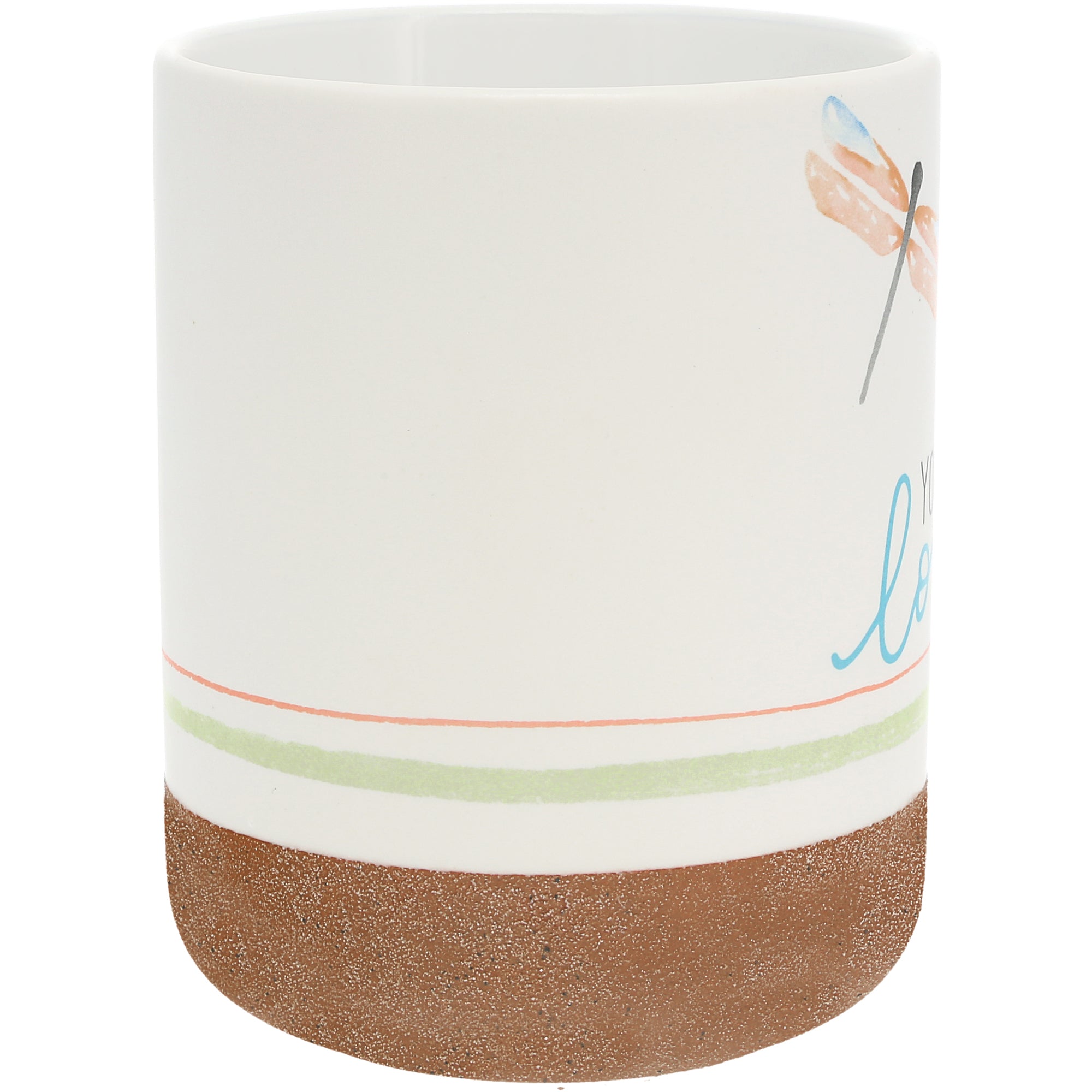 • IN-HOUSE DESIGN: The coffee cup features a glossy watercolor design encompassing a simple wrap-around striped & dragonfly design accompanied by a "You Are Loved" blue & gray sentiment on the front. Illustrations created by artist Blue Chair Blessing.
