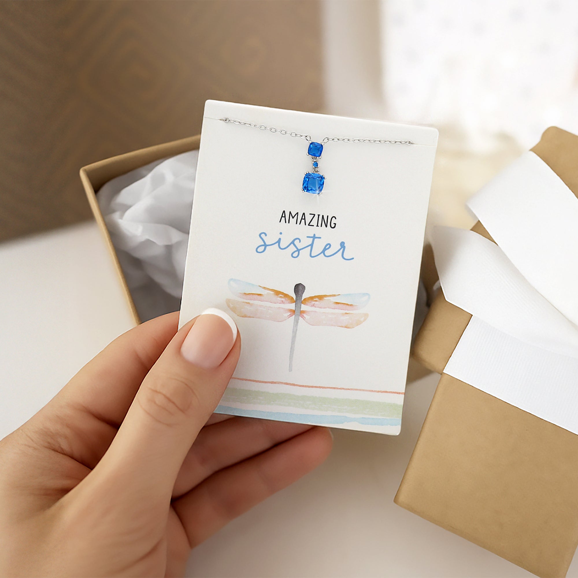 • IN-HOUSE DESIGN: The top cushion gem is 5 mm, the center round gem is 2 mm, and the largest cushion gem at the bottom is 7 mm. Each gem is set with four prongs and connecting loops. The cubic zircon gems are blue in color. The header card has a beautiful water-colored striped and dragonfly design created by Blue Chair Blessings alongside the sentiment "Amazing Sister."