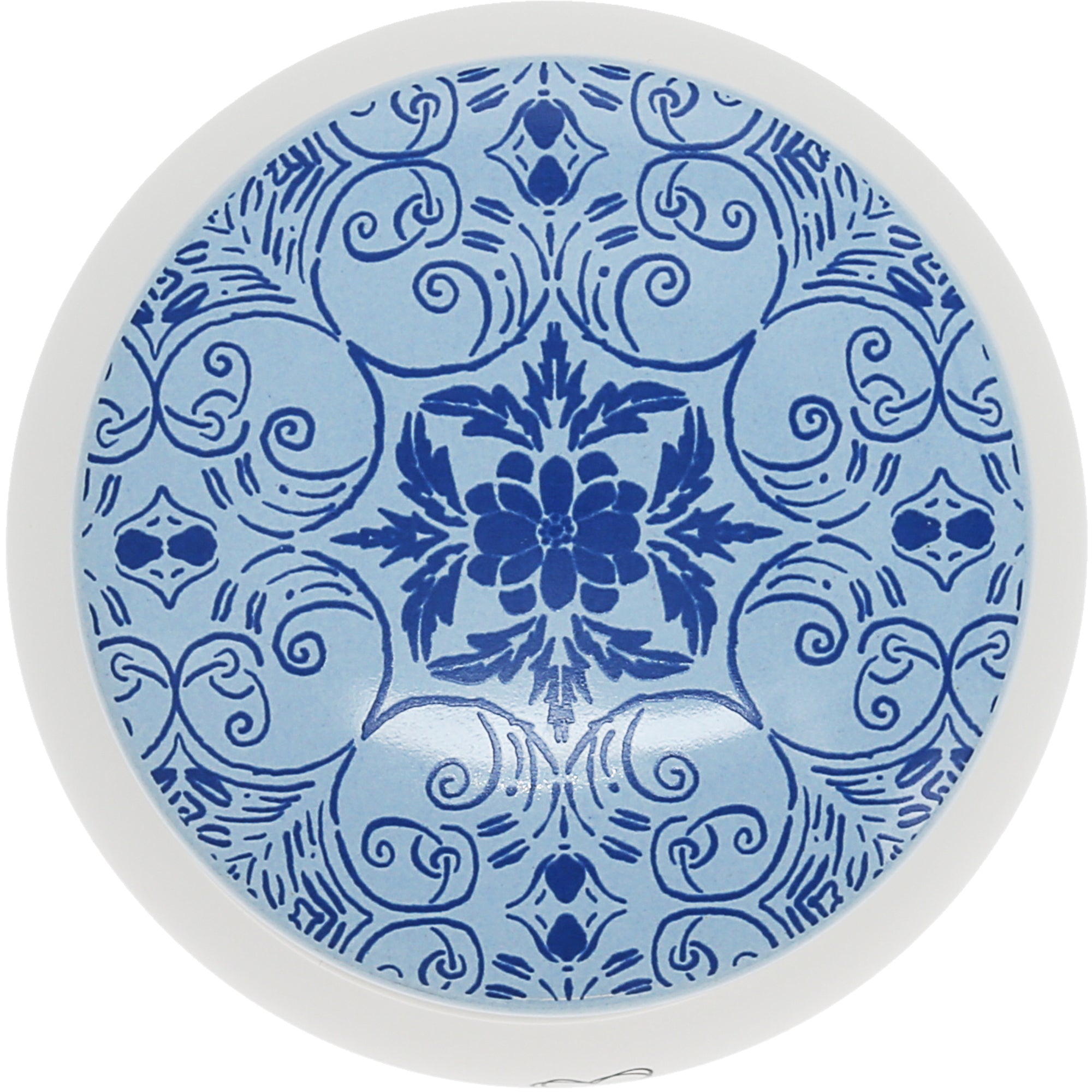 - PREMIUM QUALITY: This 3.5" x 3.5" x 2.25" white matte exterior & interior body/blue glossy lid has a damask pattern modern-styled stoneware keepsake box that is the perfect size for holding small delicate jewelry items, including rings, earrings, necklaces, and bracelets. Can keep desk items such as paper clips or push pins secure. Even use for cotton balls, Q-tips, toothpicks, bobby pin holders, and coin and change holders. The round-shaped container has a lid that is easy to lift on and off the base with a lipped edge that will keep the top from sliding off.