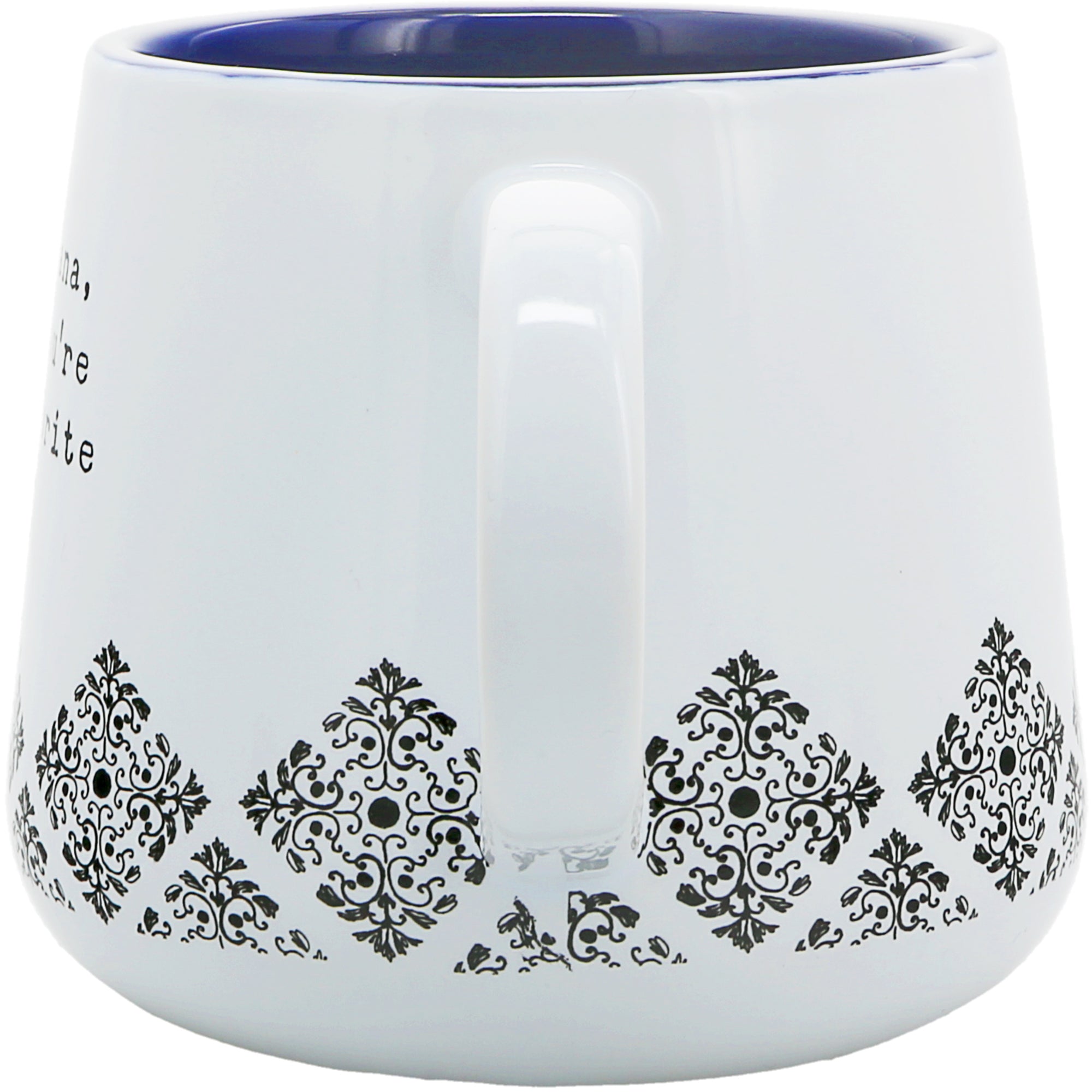 - IN-HOUSE DESIGN: You will see a typewriter written a "Nana, You're My Favorite" sentiment next to a pink & purple butterfly. A purple glossy interior smooth-edged vessel with a glossy exterior with walls that features a black square scroll design that wraps around the entire mug.
