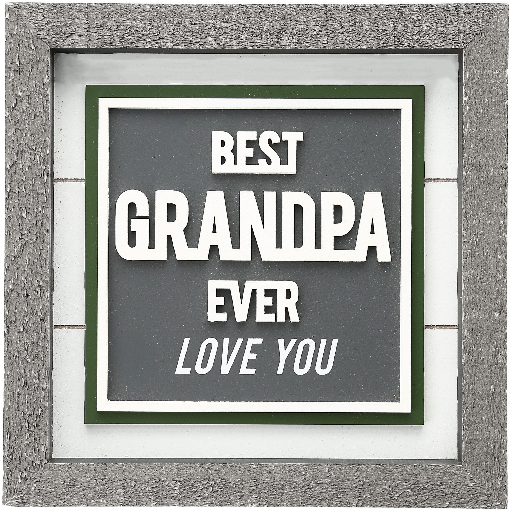 - IN-HOUSE DESIGN: Whitewashed gray pine rustic-style edges accompany a white shiplap backdrop, a raised dark gray box, and white edging. “Best Grandpa Ever” sentiment is 3-D, whereas the “Love You” text is printed onto the raised gray center.