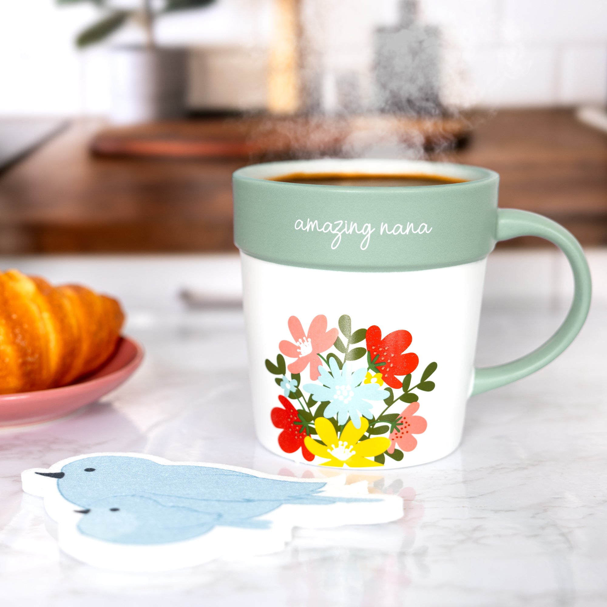 - IN-HOUSE DESIGN: The mug showcases a soft pastel floral arrangement, with the endearing message "Amazing Nana" in an elegant font. The coaster is shaped like a bluebird, symbolizing love, wisdom, and family connections.