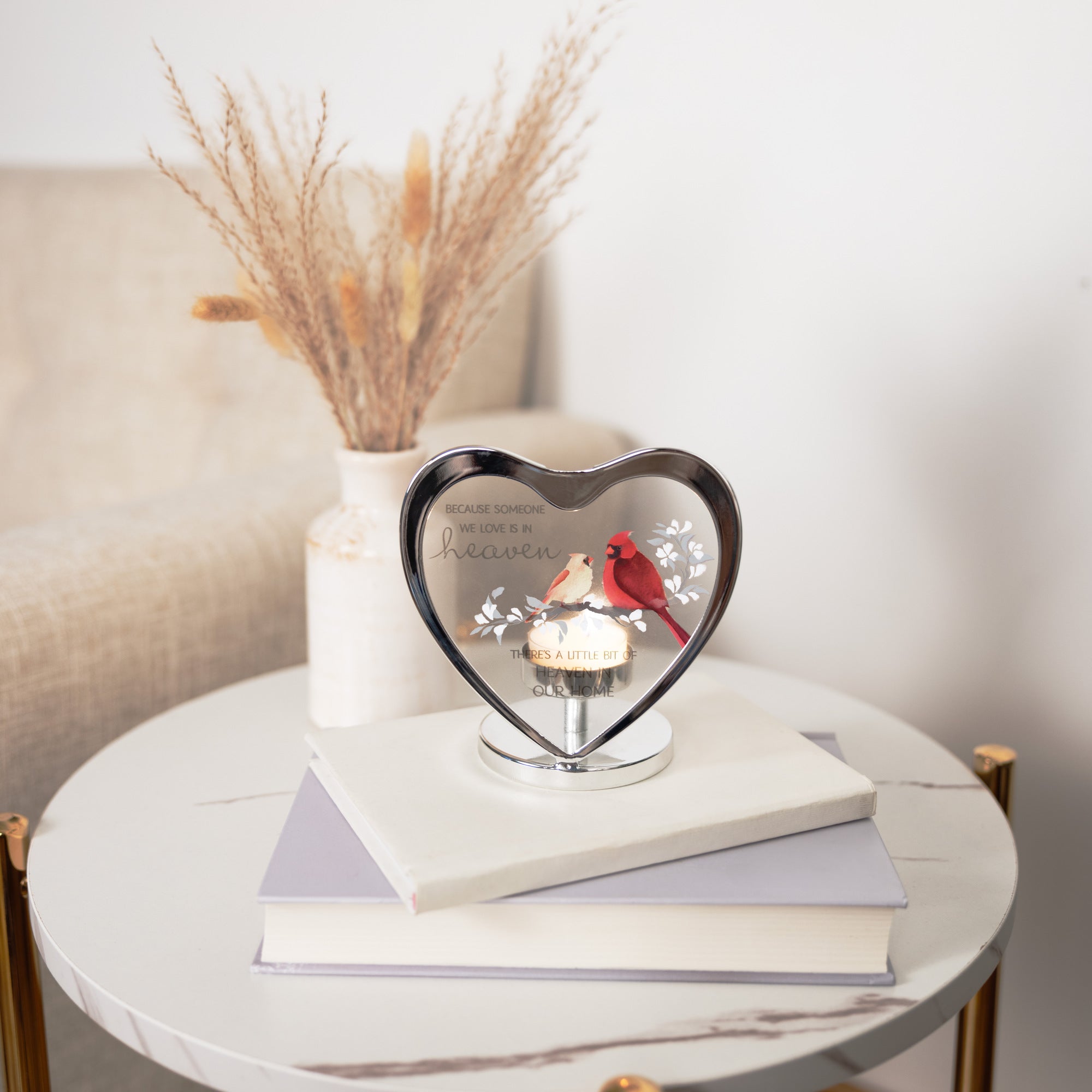 - IN-HOUSE DESIGN: A pair of vibrant red cardinals perches on a delicate cherry blossom branch, accompanied by the sentiment, "Because Someone We Love Is In Heaven, There's A Little Bit Of Heaven In Our Home." This heartfelt message is beautifully displayed on the center of the holder.