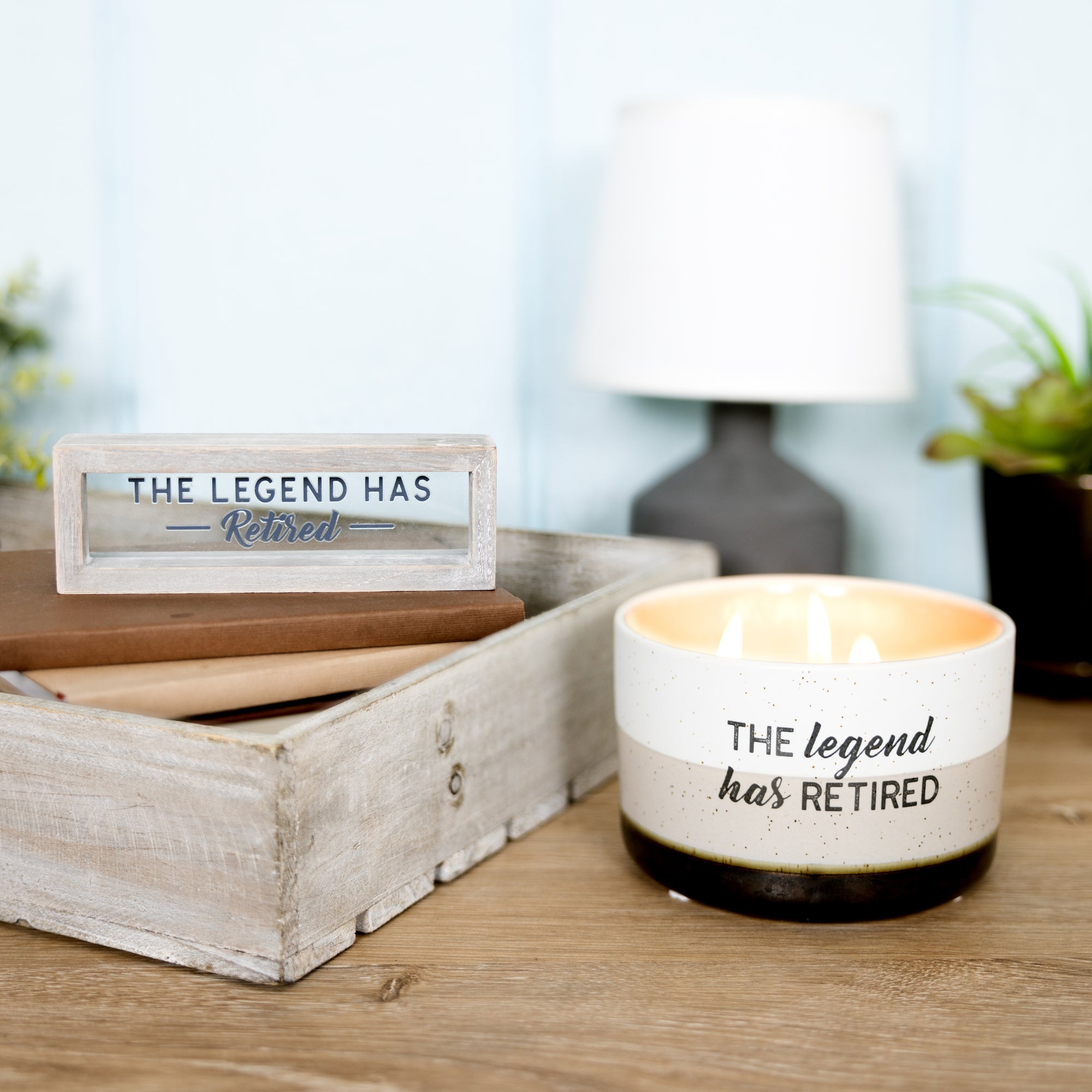 - PREMIUM QUALITY: This 6" x 2" wood-framed glass plaque features a whitewashed gray frame, sturdy construction, and a sleek design. The phrase "The Legend Has Retired" is displayed in elegant black text with a cursive font, giving it a classic look. The plaque is freestanding or hangable with a metal sawtooth hanger. It comes safely packaged in a protective die-cut box.