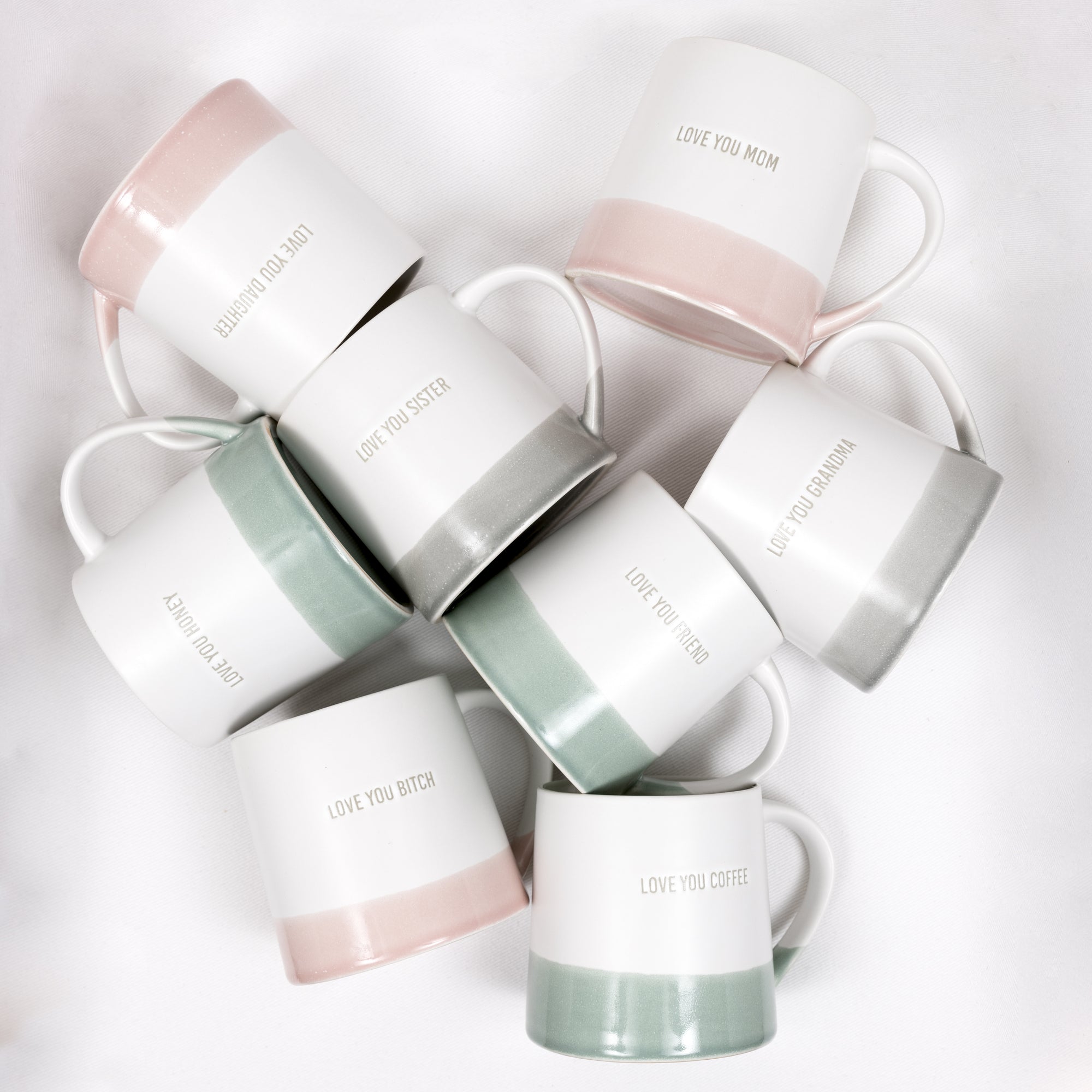 - IN-HOUSE DESIGN: The hand-dipped 1/3 pink-colored bottom is unique to each piece. The tan debossed "Love You Daughter" sentiment is stamped in the middle center of the white upper half of the front side of the cup. This simplistic, modern-styled mug is the perfect addition to any drinkware collection.