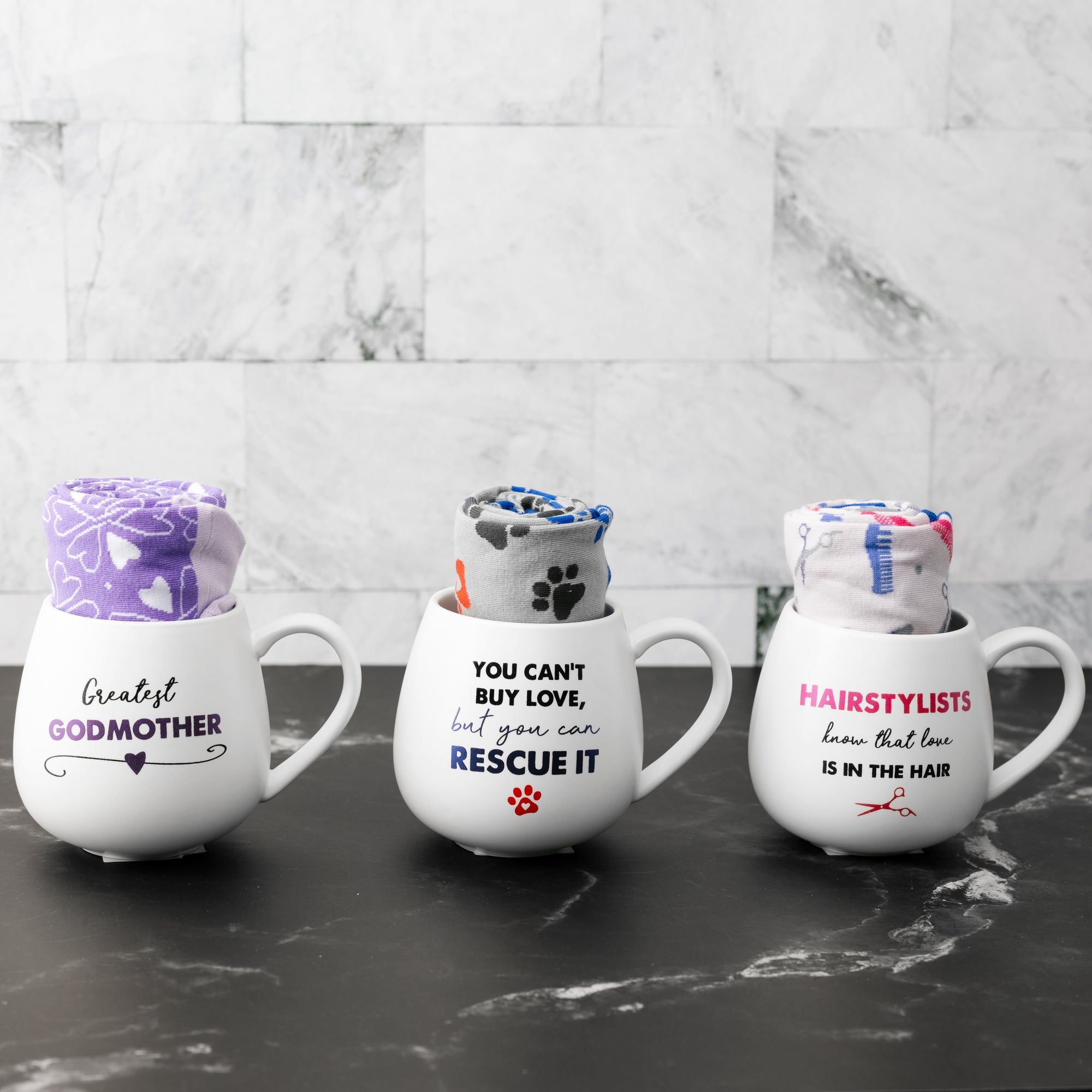 - IN-HOUSE DESIGN: Socks feature blue, red and black paw print pattern on a gray background. The heals, toes, and ankles are solid blue. The mug has blue and black "You Can't Buy Love, But You Can Rescue It" text and a red paw print with a heart center decal is printed onto one side of the mug.