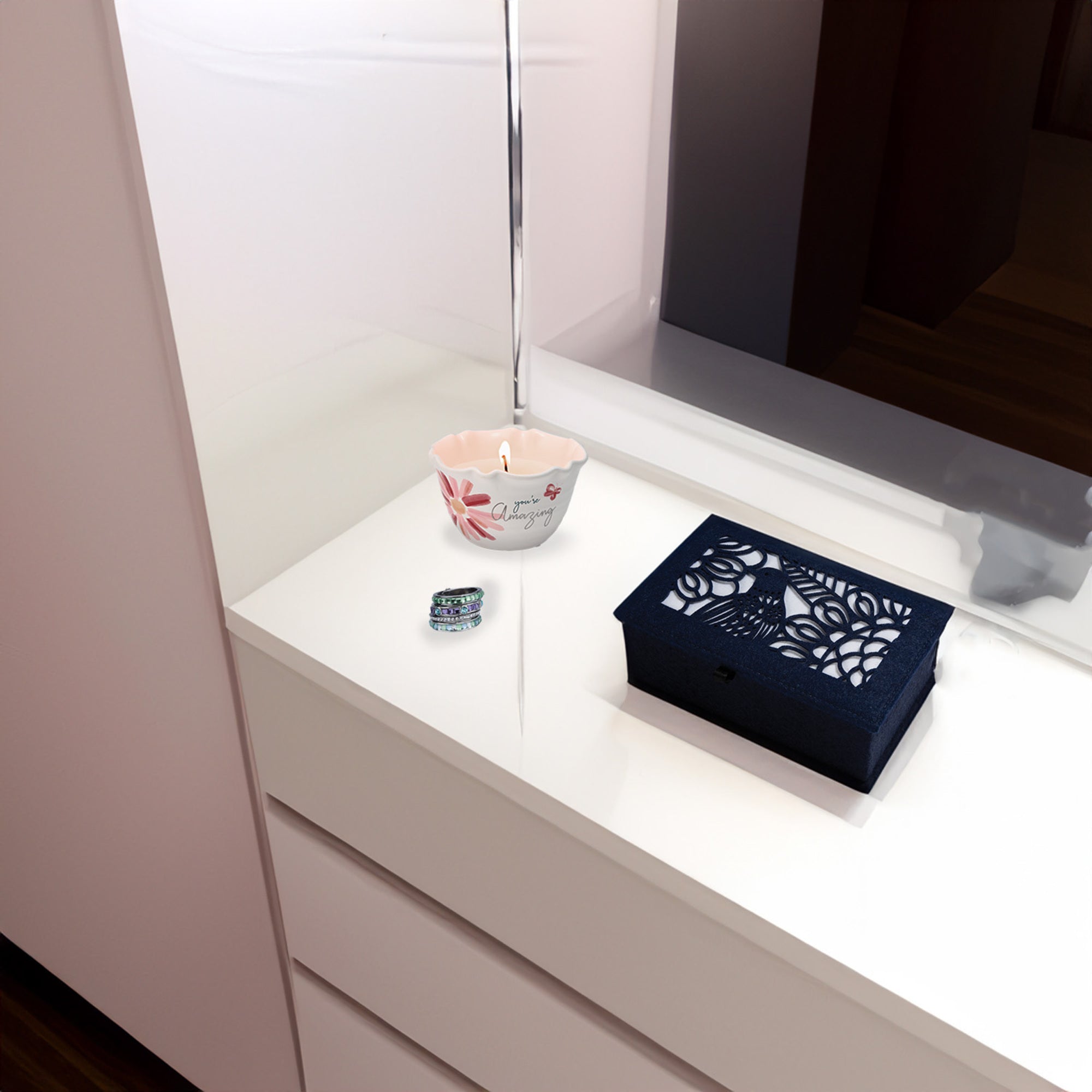 - IN-HOUSE DESIGN: The jewelry box features an intricate laser-cut pattern on the lid, showcasing an elegant design that reveals the contrasting ivory satin layer beneath. Inside, it includes divided sections and a mirror, making it both functional and decorative.