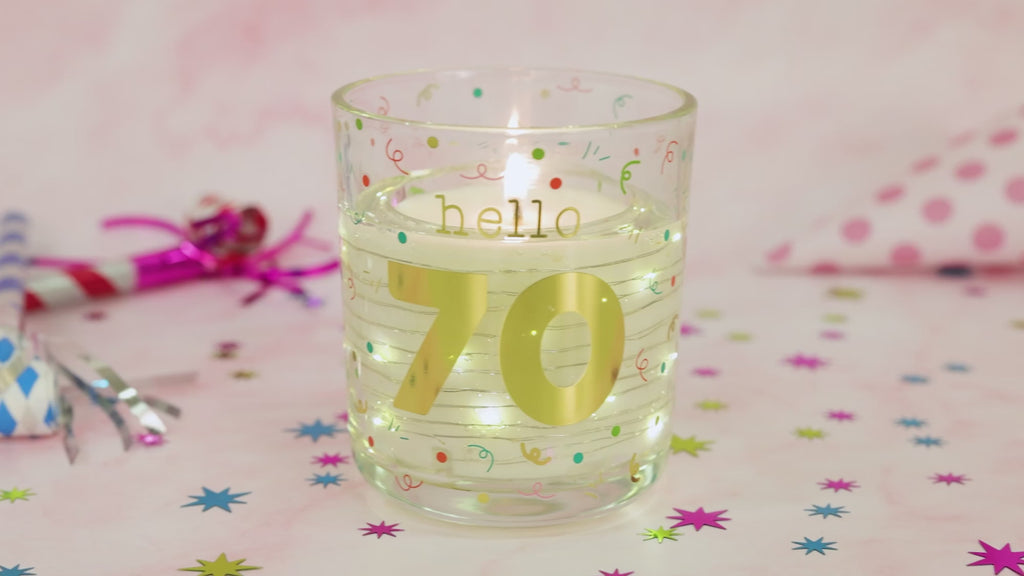 - PREMIUM QUALITY: This single-wick soy wax LED candle features a colorful confetti design on a sturdy glass vessel. The "Hello 70" gold metallic text is prominently displayed alongside festive balloons, adding a celebratory touch. This candle can be lit or you can use a candle lamp to activate the LED lights. Packaging includes a Kraft die-cut box, making it gift-ready.