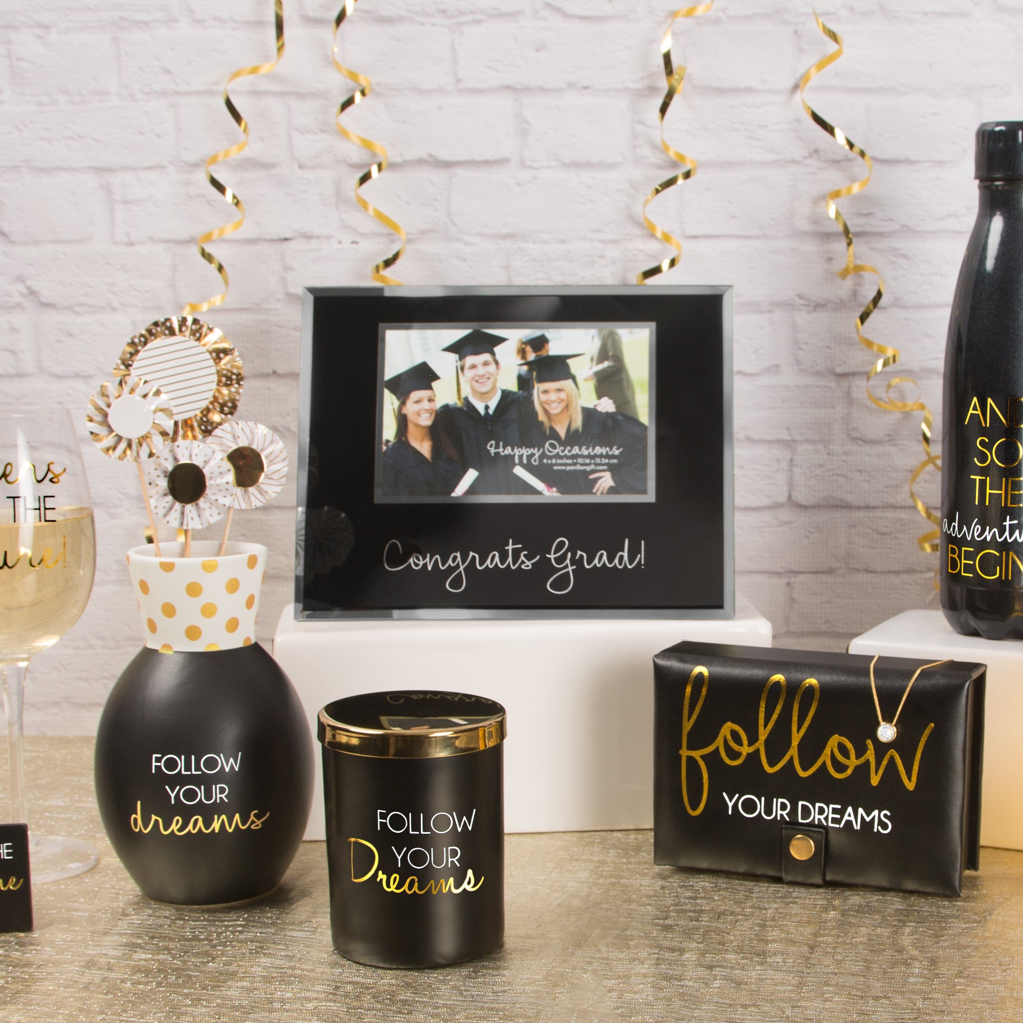 - IN-HOUSE DESIGN: "Congrats Grad!" text is printed onto the front of the frame beneath the replaceable photo.