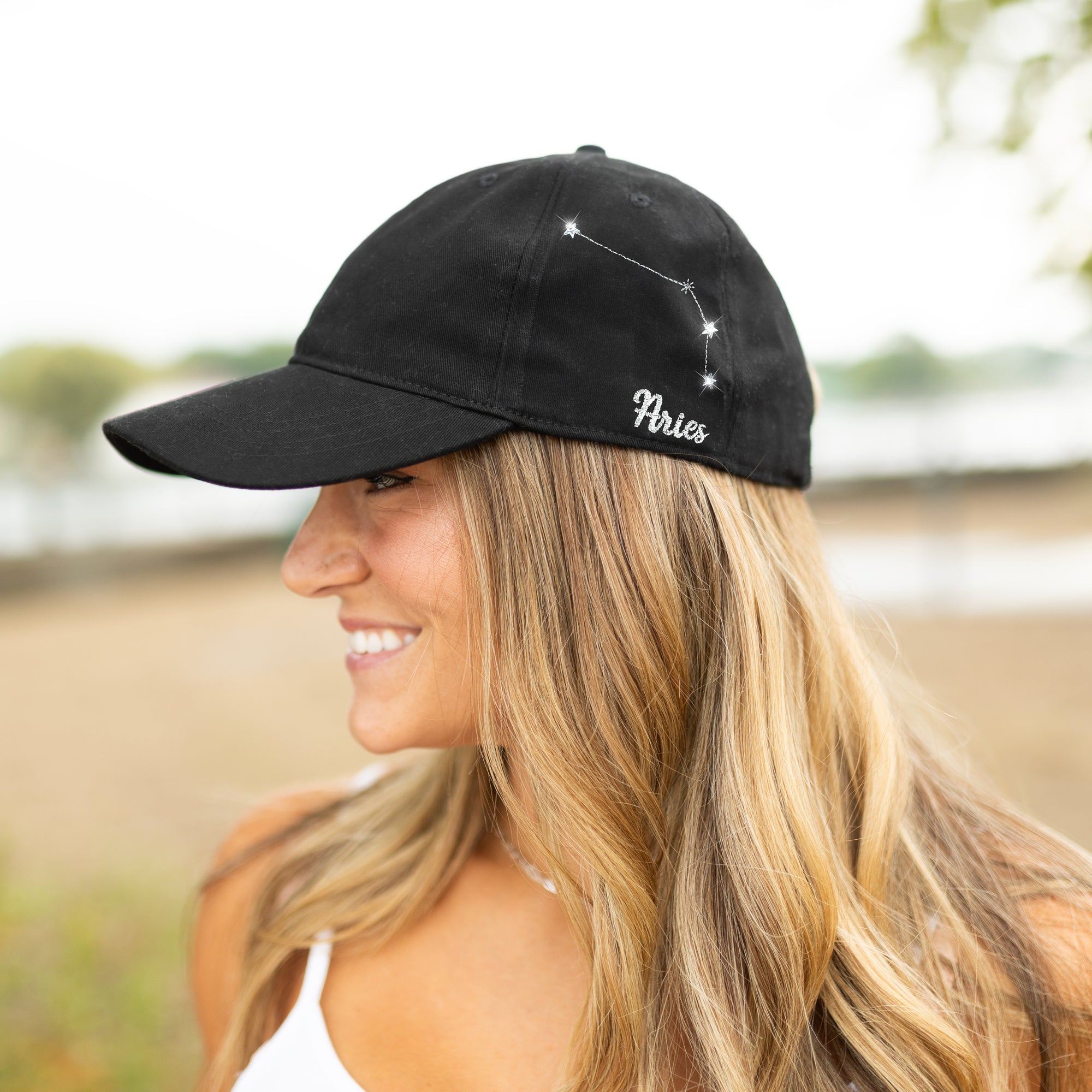- IN-HOUSE DESIGN: The front of the black hat featured a white celestial birth sign embroidered in white. The right side of the hat features a white "Aries" sentiment along with a zodiac constellation featuring stars and gem details also embroidered in white.