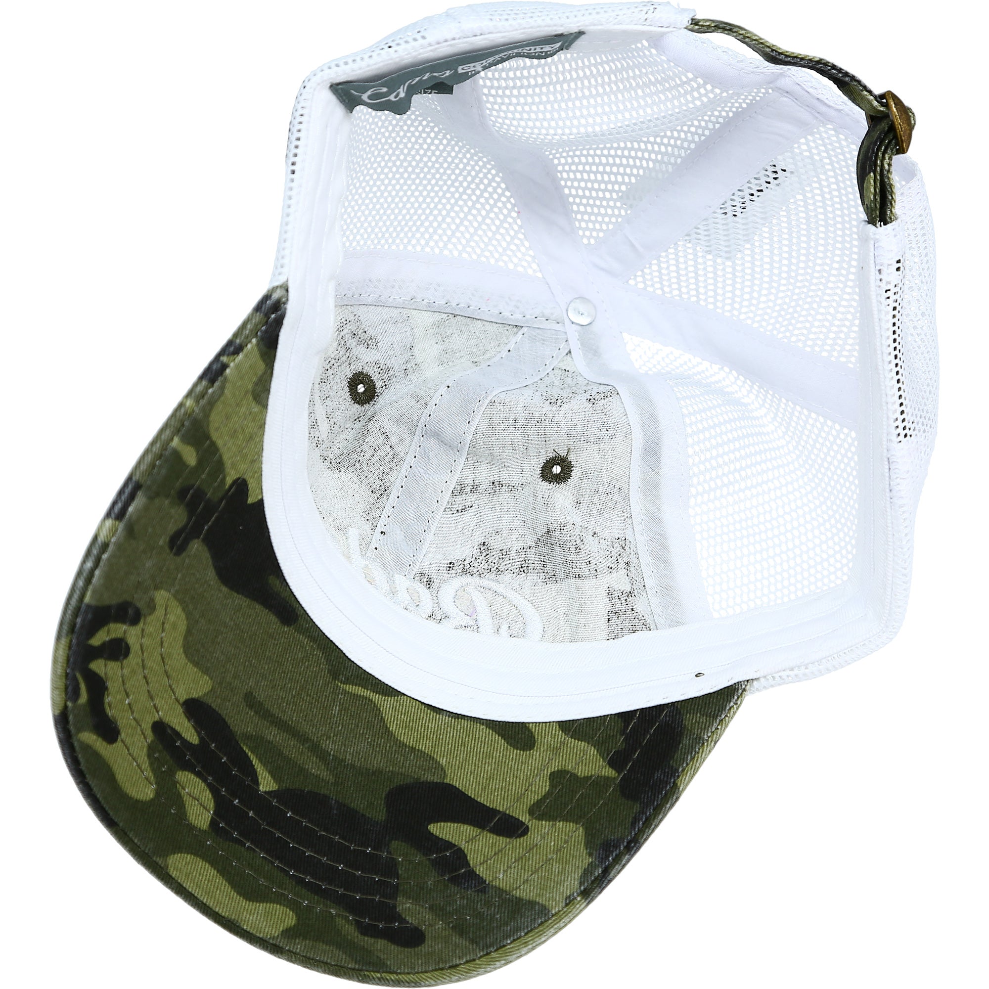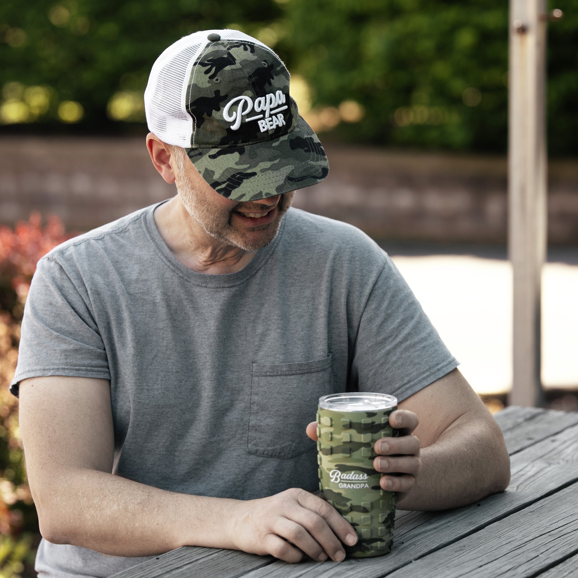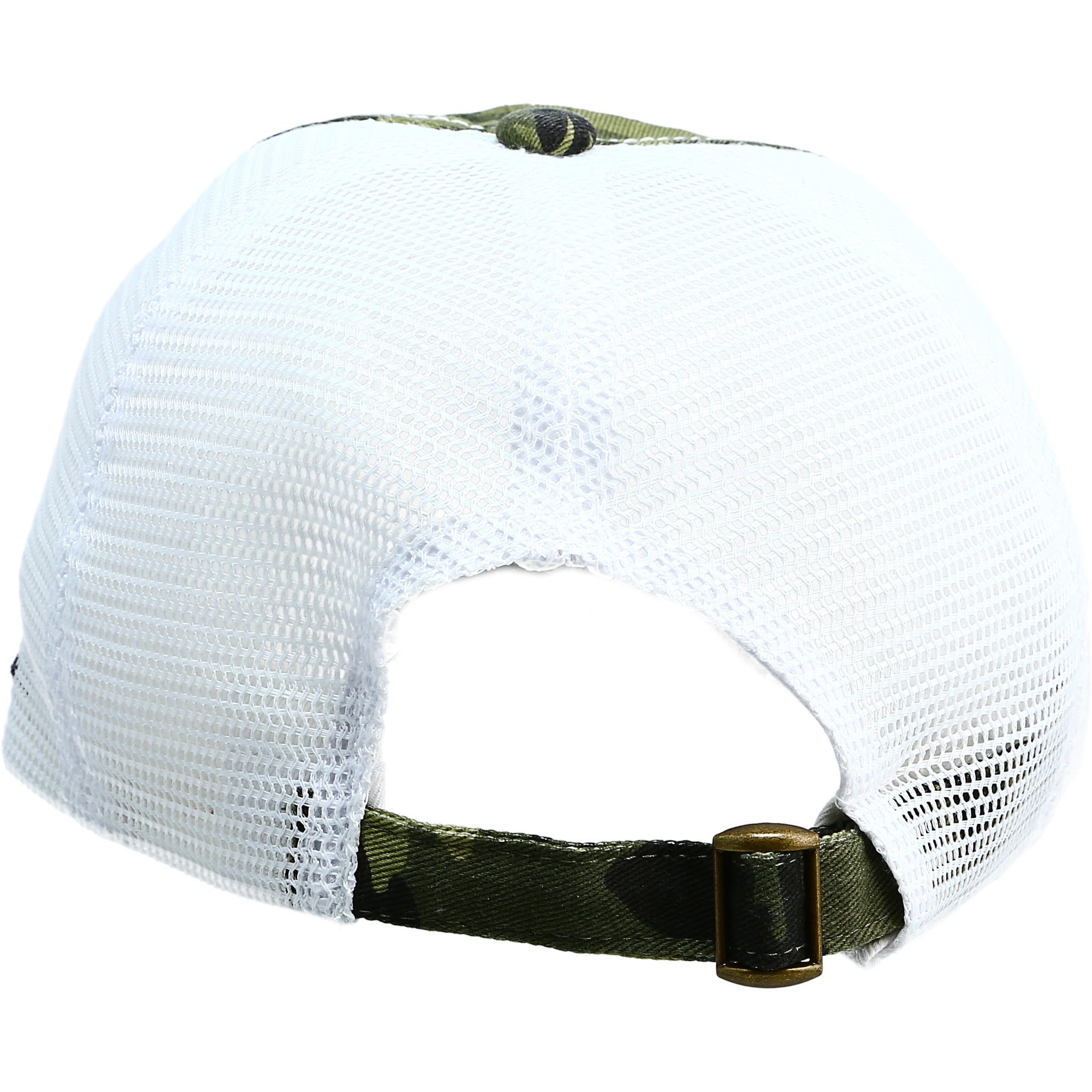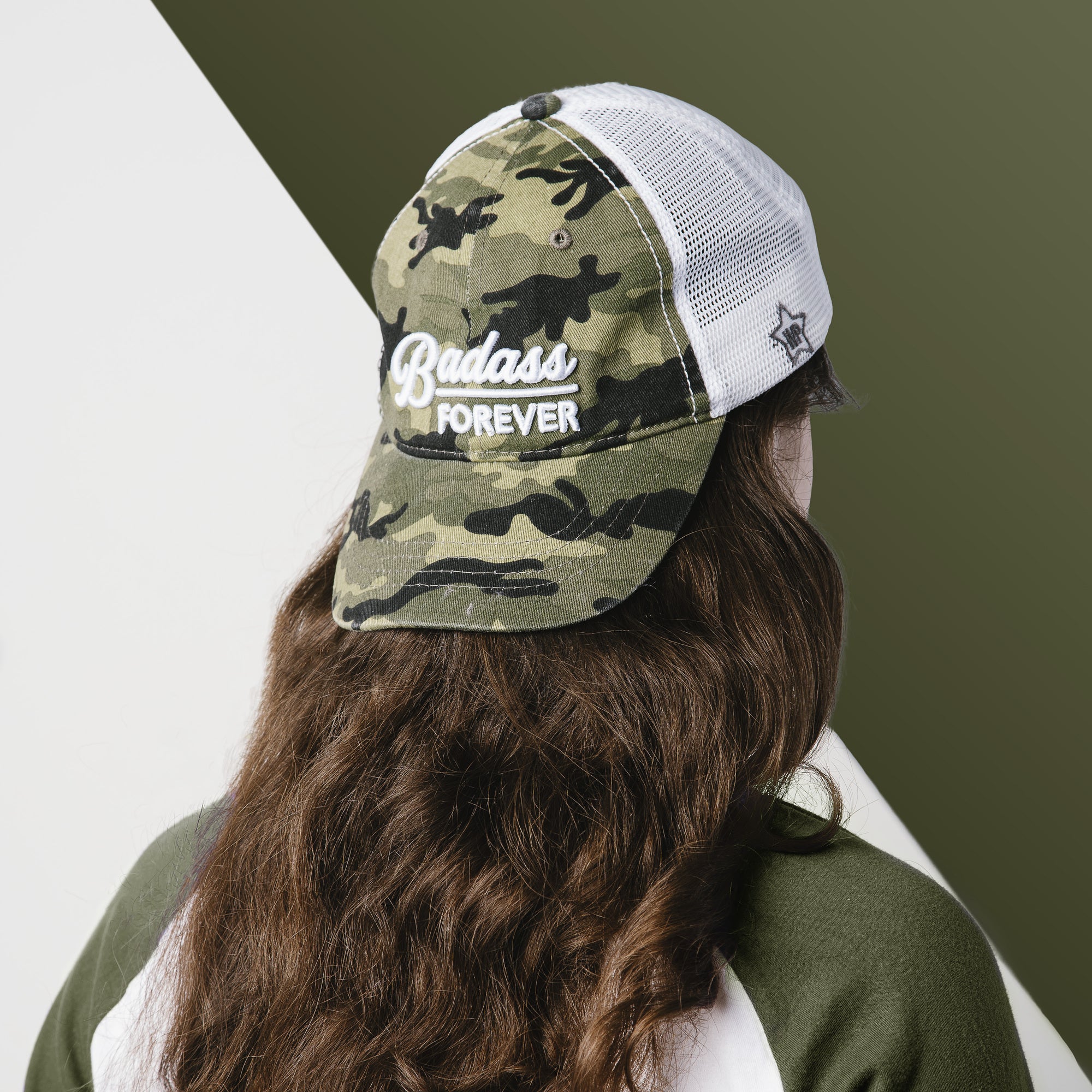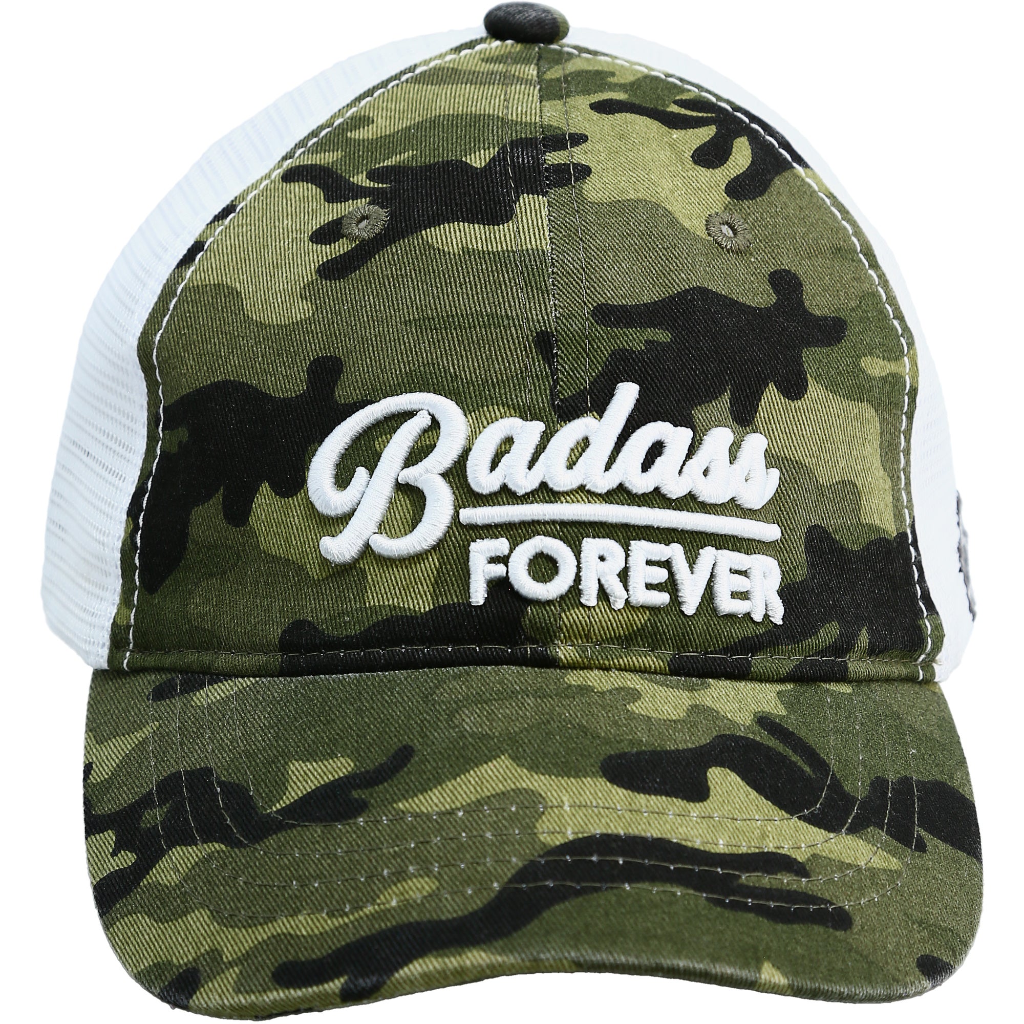 - IN-HOUSE DESIGN: Features a printed green camo patterned on the front and brim of the hat. The backing is white mesh and features a snap, along with an adjustable strap that can be tucked away. The front of the hat features a 3d embroidered patch "Badass Dad" text. Comes packaged in a polybag with a plastic j hook and hangtag.