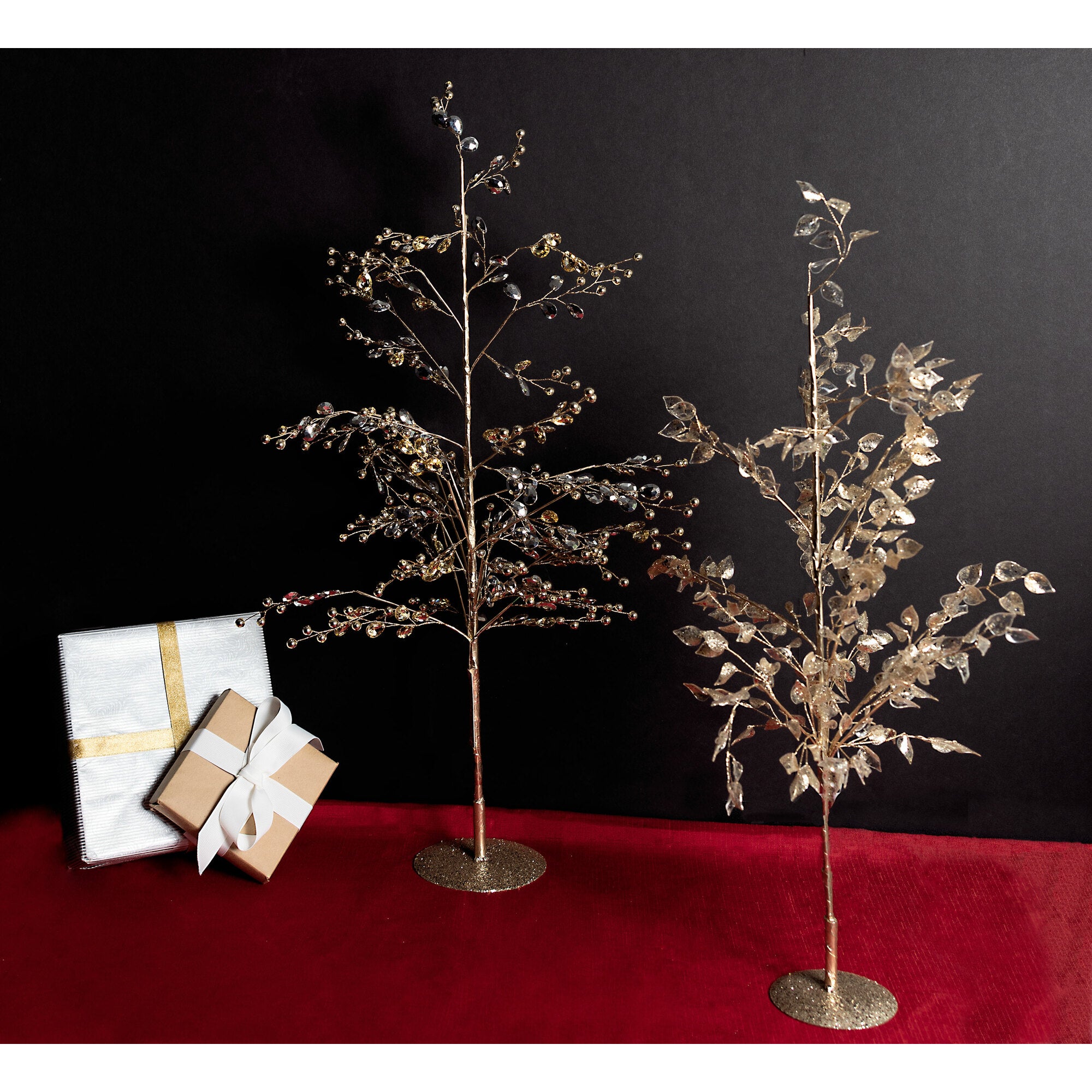 - PREMIUM QUALITY: These trees are made from a combination of metal, acrylic, paper, glitter, gems, and beads. The 25" tree has 18 stems with about 200 clear sparkly gems, several hundred gold beads, and a 4.5" diameter glitter base. The 22" tree has 15 stems with hundreds of glitter leaves and a 3.5" diameter glitter base. The trees fluffy out to about an 11" span each.