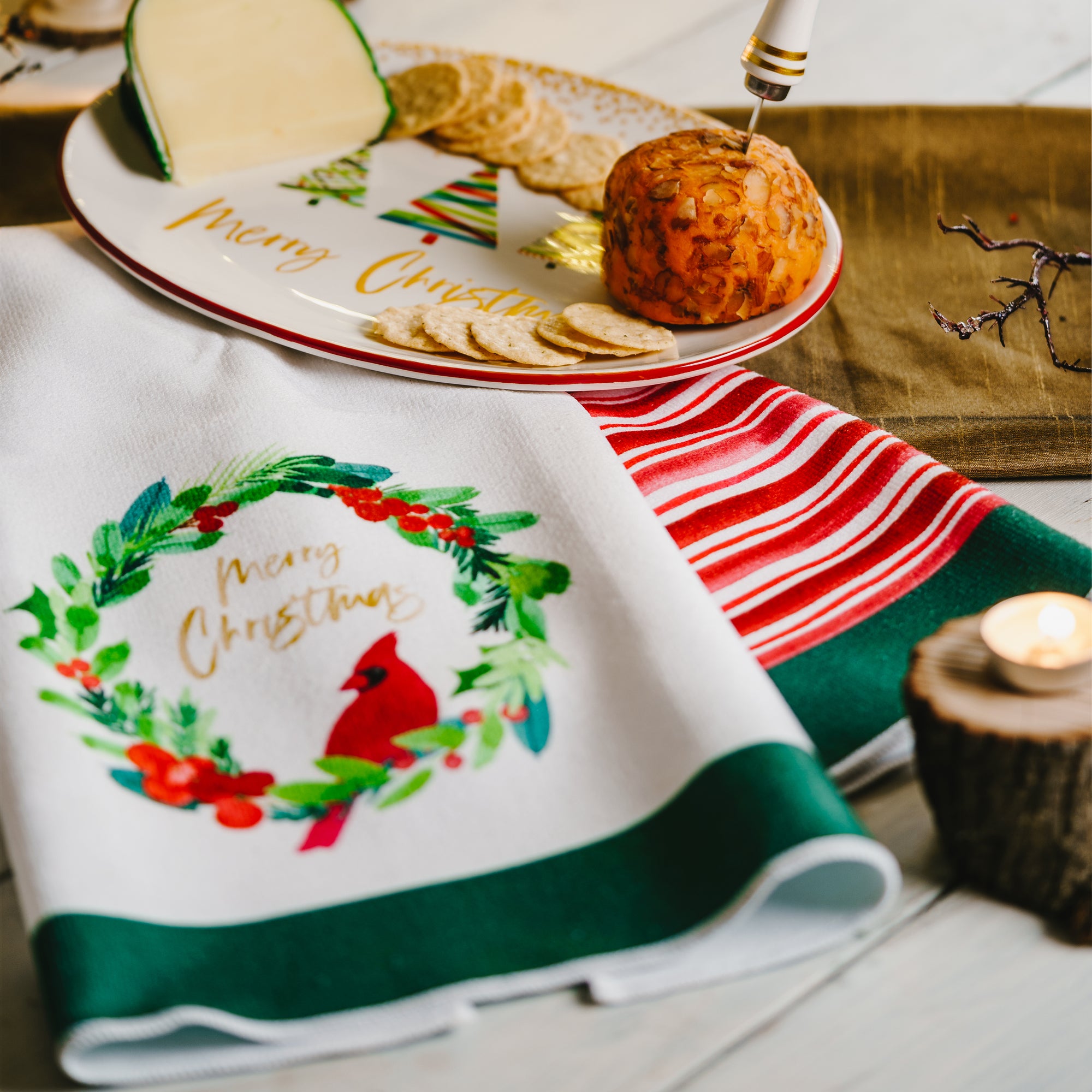 - IN-HOUSE DESIGN: Red and green watercolor paint-inspired robin bird and berry wreath pattern is accompanied by gold "Merry Christmas" sublimation printed sentiment on the front side of one towel with a color-block green bottom. The other towel features a red striped pattern with a color-block green bottom. The artwork was designed by artist Stephanie Ryan.