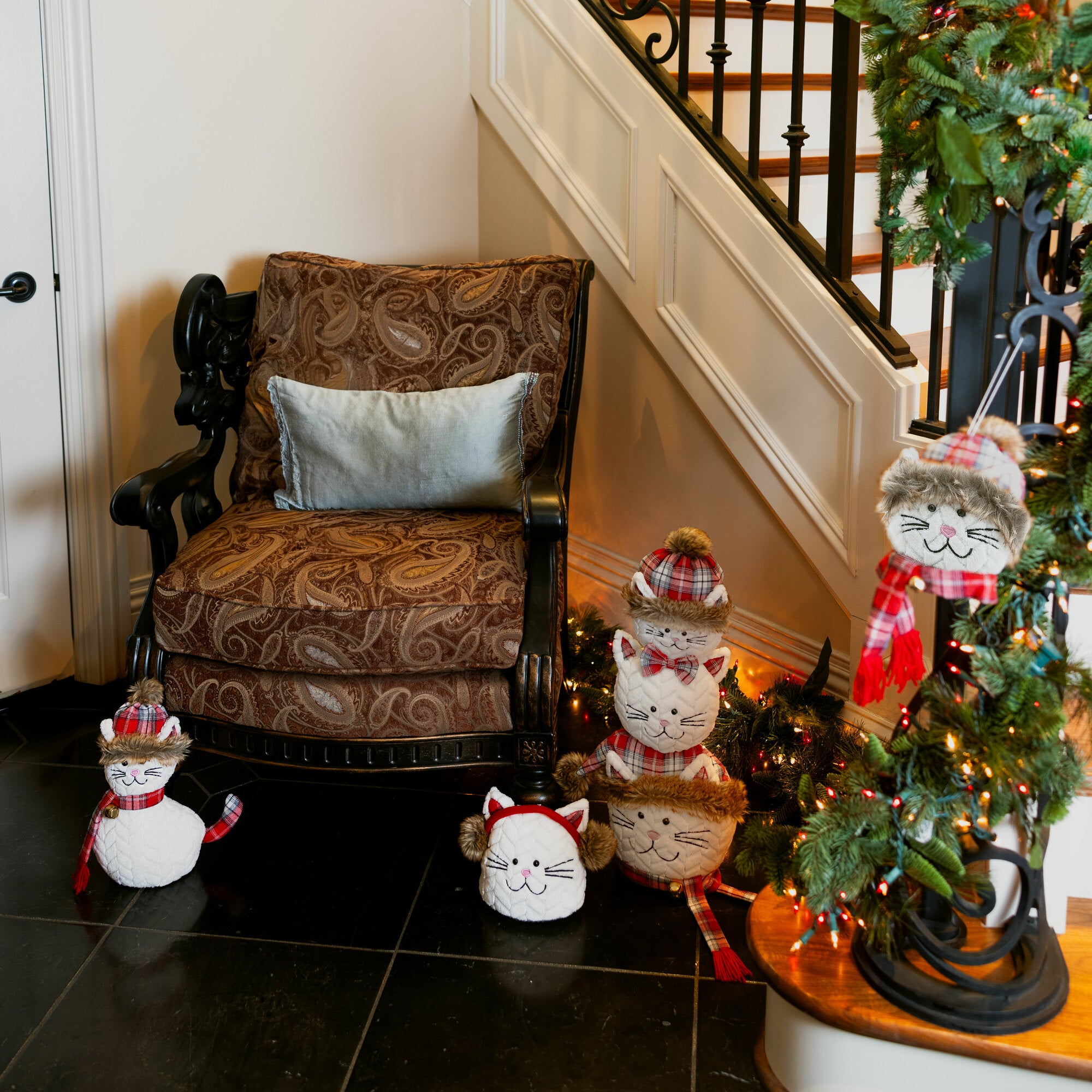 - PREMIUM QUALITY: The cat has a black embroidered face, a felt gray nose, and plastic black and gray eyes. The top has a string for hanging. The gold bell is glued on. Meanwhile, the red plaid details and debossed white chevron patterns are made from 100% polyester.