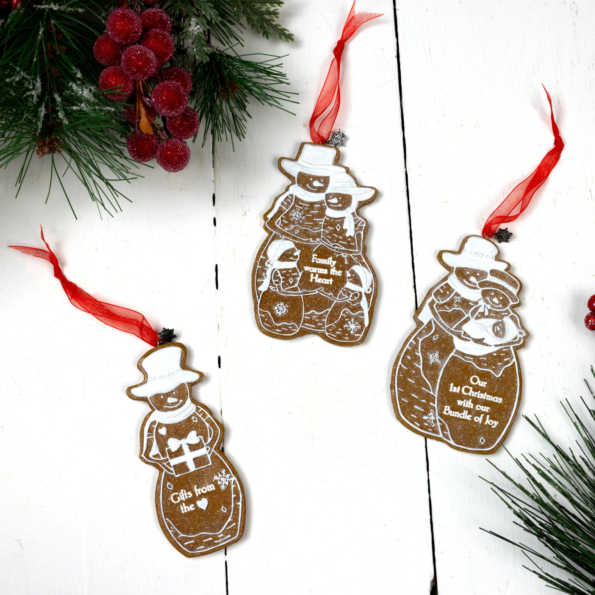 • IN-HOUSE DESIGN: The snowman ornament features the heartwarming sentiment, "Gifts from the Heart," debossed on the front and highlighted with a white raised "icing" detail that mimics the look of a real gingerbread cookie. The snowman holds a beautifully wrapped gift, complete with a white bow, making this ornament a lovely symbol of holiday generosity. The high-gloss finish and snowflake charm give this piece a polished look, perfect for any Christmas tree.