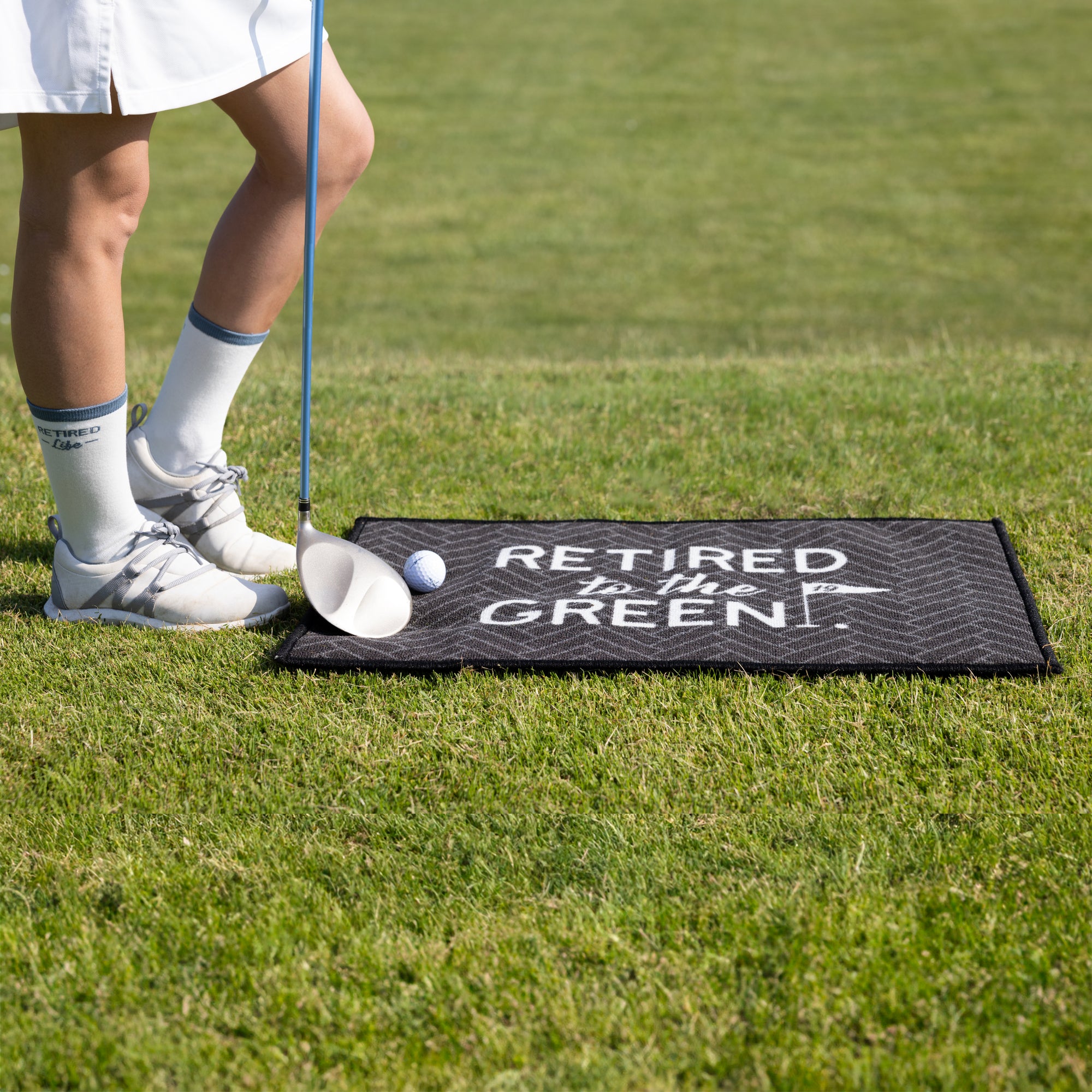 - IN-HOUSE DESIGN: The gray rug has a herringbone printed pattern in light gray. The white "Retired To The Green" sentiment is accompanied by the "19" flag marker and golf ball.