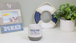 - IN-HOUSE DESIGN: The new & innovative candle offers a unique hidden special message within the wax as time progresses. The wax reveal begins to show after 10 minutes and is fully visible after 50 minutes of burn time. Overall burn time is 27-30 hours. The front side of the vessel features a blue pair of flip-flops and a line design accompanied by a "Beach Mode. Relax & Breath" sentiment. The wax has a sizeable blue flip-flop design.