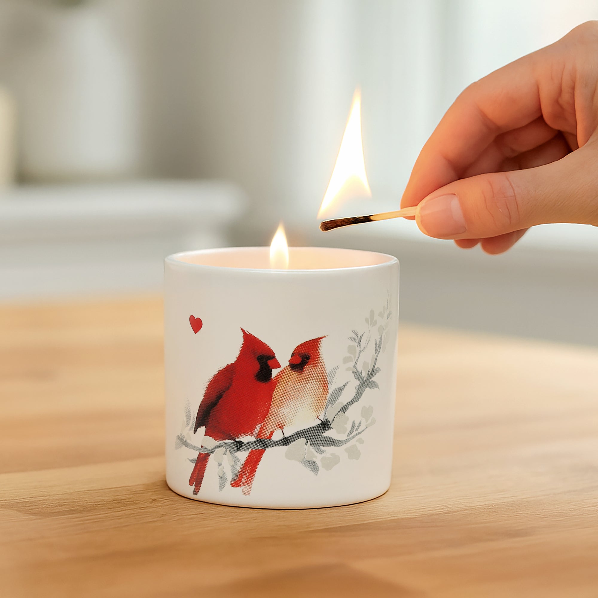 - PREMIUM QUALITY: This 2.5 oz 100% soy wax candle offers a soft, peaceful aroma of tranquility and is set in a high-gloss white ceramic jar. The design features two red cardinals perched close together on wintery branches with a pair of hearts above—symbolizing togetherness, eternal love, and the comforting presence of loved ones.