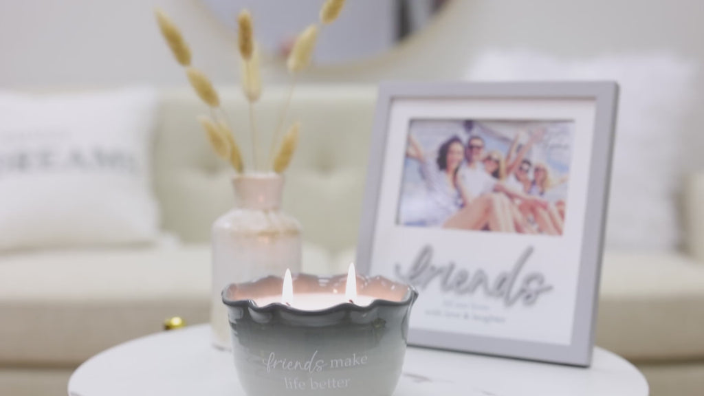 - IN-HOUSE DESIGN: The new & innovative candle offers a unique message for your loved one within the wax as time progresses. You will see cursive written "Forever Friends" sentiment after about 10 minutes. As you watch, the entire decal will appear after 60 minutes. Then, the message will hide again and reappear with each burn. The front of the candles has a simplistic "Friends Make Life Better" decal accompanied by an ombre tan & gray pattern.