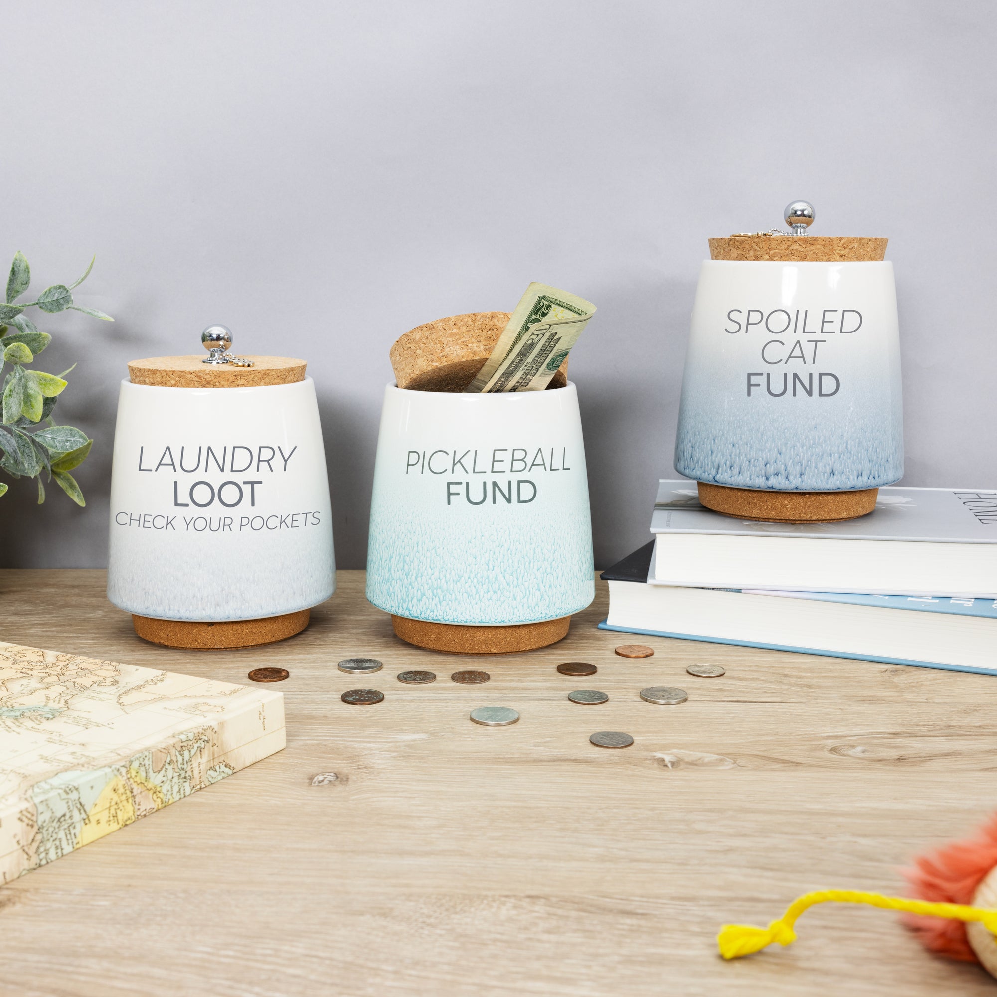 - IN-HOUSE DESIGN: The front side of the piggy bank has a simplistic "Laundry Loot Check Your Pockets" gray sentiment and an ombre glossy reactive dripped speckling glaze that fades from white at the top to gray at the bottom. The interior of the jar features fill lines accompanied by sentiments that are .75 inches from one another. The very bottom line "Not Enough Fund$" goes up to 1.5 inches from the base, followed by "Getting There," leading to "So Much Fund$" with "Fully Funded" at the top.