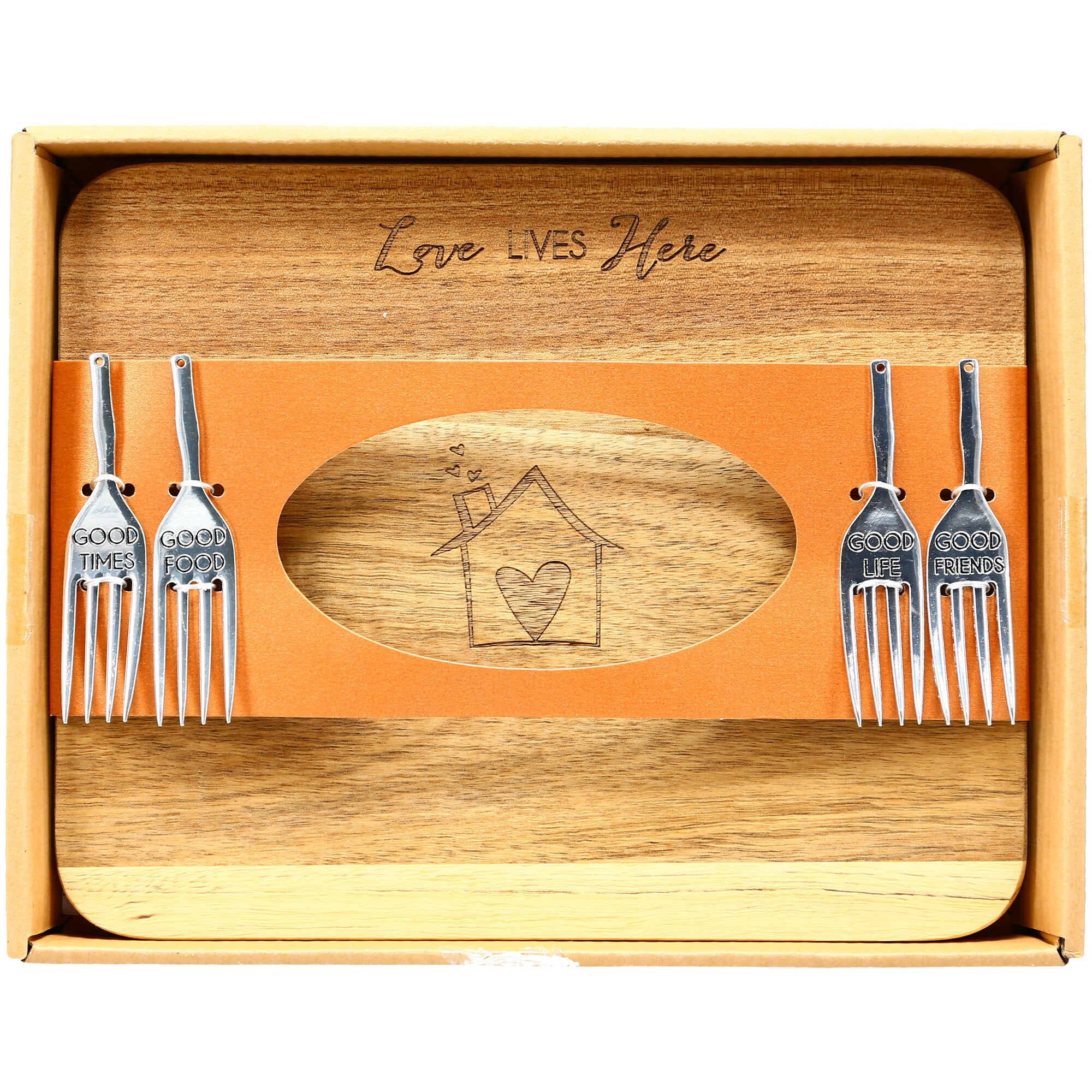 - IN-HOUSE DESIGN: "Love Lives Here" text and accompanying house icon are both laser engraved into the top of the board. Accompanying forks feature engraved "Good Times", "Good Food", "Good Friends", "Good Life" texts.
