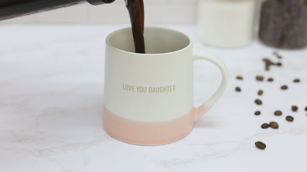 - IN-HOUSE DESIGN: The hand-dipped 1/3 pink-colored bottom is unique to each piece. The tan debossed "Love You Daughter" sentiment is stamped in the middle center of the white upper half of the front side of the cup. This simplistic, modern-styled mug is the perfect addition to any drinkware collection.