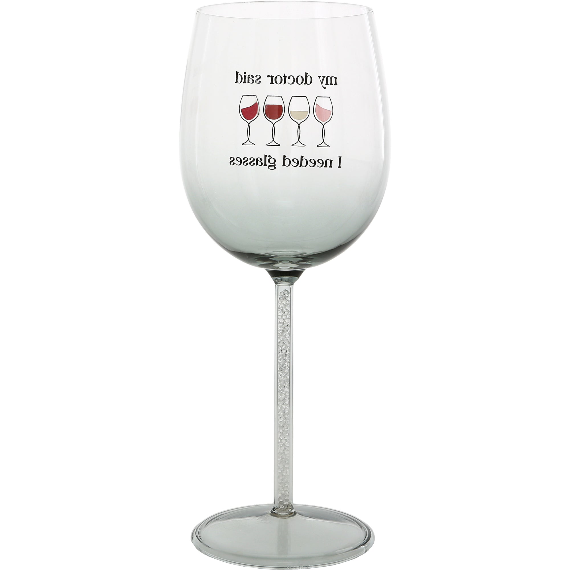 - IN-HOUSE DESIGN: This wine glass showcases the playful sentiment, "My doctor said I needed glasses," in bold lettering, complemented by charming illustrations of wine glasses that add to its humor. The grey spray-accented stem is filled with clear crystal gems, providing a subtle sparkle that beautifully contrasts with the clear glass. Combining elegance with a touch of humor, this glass is perfect for both casual sipping and special occasions, making it a delightful gift for any wine enthusiast.