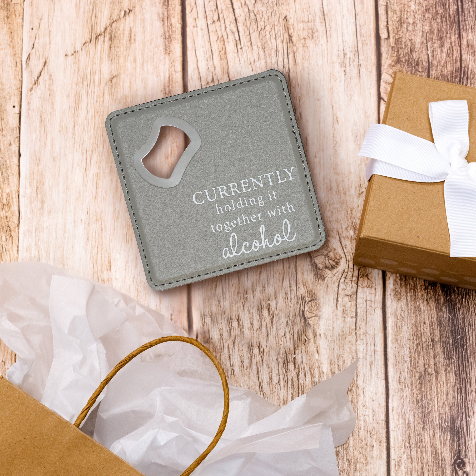- IN-HOUSE DESIGN: "Currently Holding It Together With Alcohol" white cursive & serif fonts are laser engraved into the bottom right corner of the front of the beverage coaster/beer mat. Your friends and family will love the superior premium design; they'll also want one!