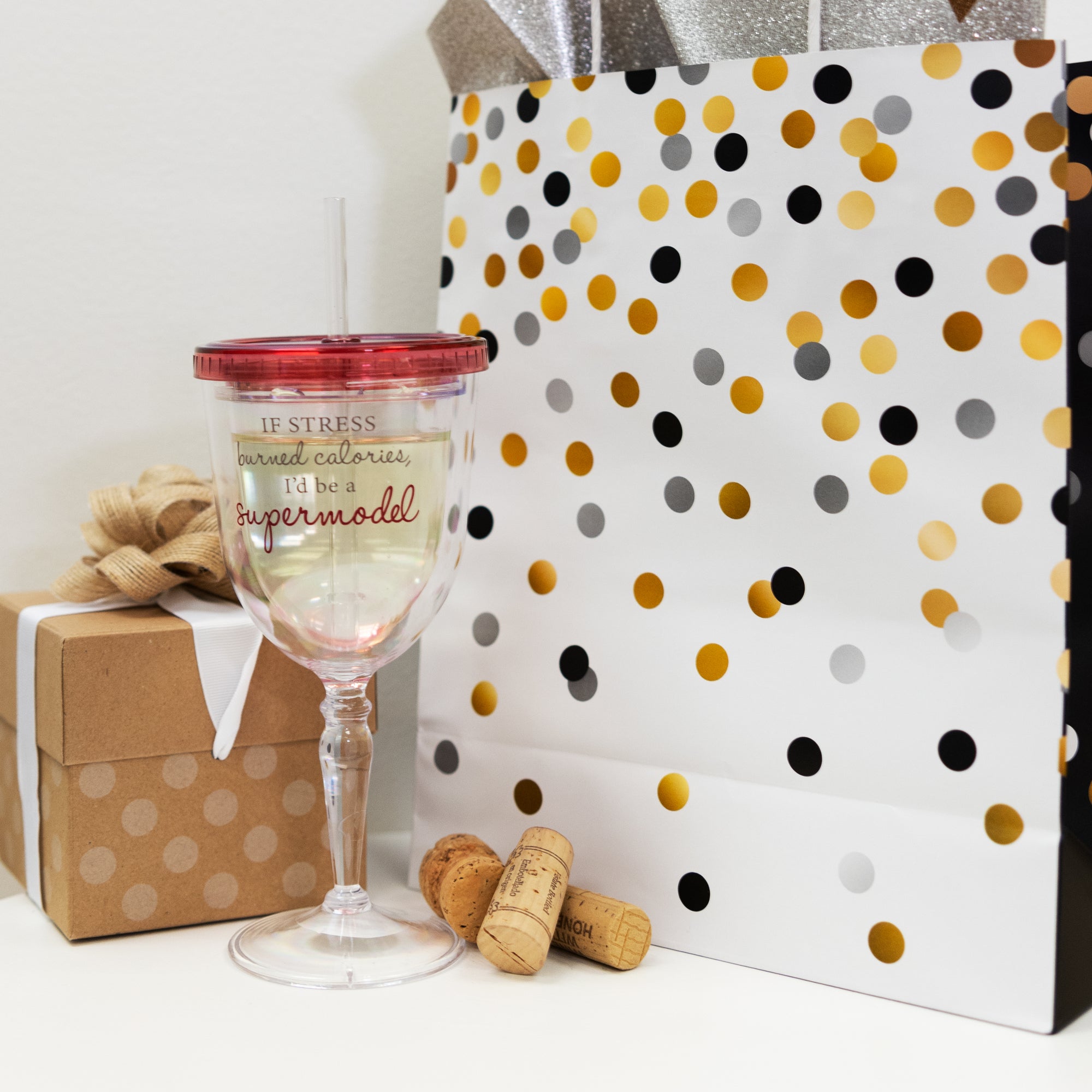 - IN-HOUSE DESIGN: “If Stress Burned Calories, I’d Be A Supermodel” decal is applied to the front of the wine tumbler. Features a BPA-Free reusable straw and a convenient pink screw-top lid for on-the-go sipping.