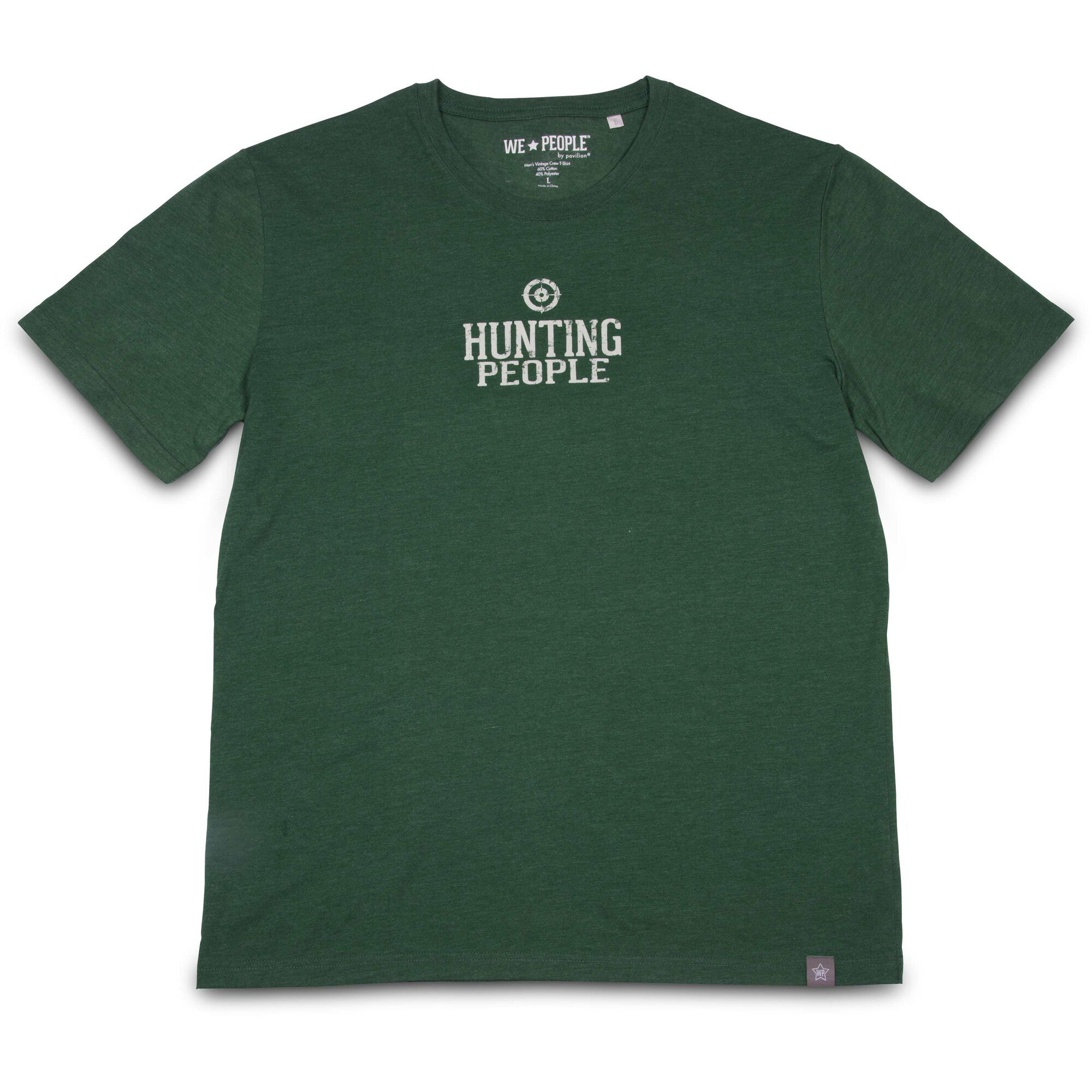 • IN-HOUSE DESIGN: "Hunting People" text and logo are printed on the front of the shirt.