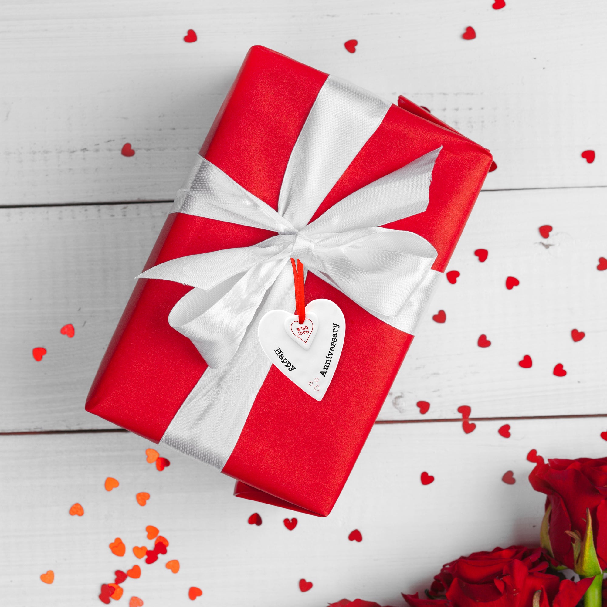 - IN-HOUSE DESIGN: "Happy Anniversary" glossy black typewriter front sentiment on the left & right sides of the bigger matte heart and a small red triple heart design coordinates in the bottom center. The smaller heart likewise has "with love" written on the front in red with another heart outline.