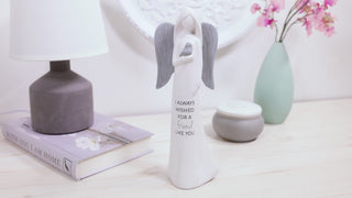 - PREMIUM QUALITY: The delicate hallowed interior 9" angel figurine is constructed from terracotta. Her long side parted hair drapes in a v down the center of her back where her gray hand wood carved patterned wings are connected. Her long dress flows seamlessly around the ground. Overall white finish with soft faded gray brushmark strokes for added dimension. She holds her right hand over the center of her chest with a bird, and her left-hand lies softly over her thigh.