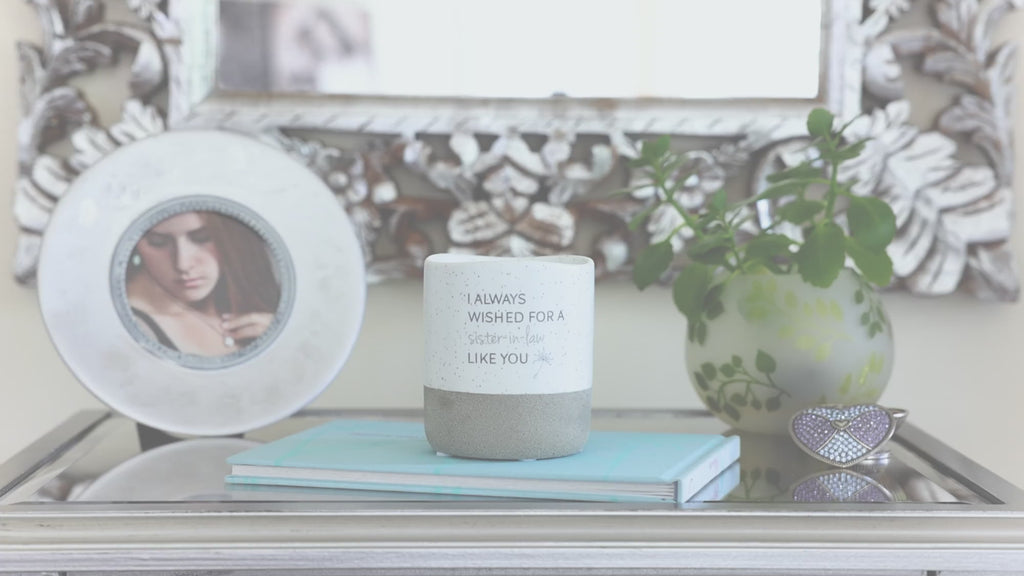 - IN-HOUSE DESIGN: The new & innovative candle offers a unique message for your loved one within the wax as time progresses. You will begin to see the black dandelion and "Amazing Sister-In-Law" sentiment after about 10 minutes. As you watch, the entire decal will appear after 50 minutes. Then, the message will hide again and reappear with each burn. The front of the candles has a simplistic "I Always Wished For A Sister-In-Law Like You" decal accompanied by a light gray dandelion.