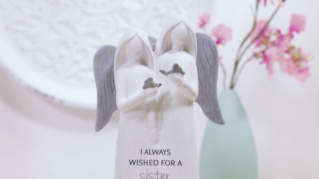 - PREMIUM QUALITY: The delicate hallowed interior 9" double-angel figurine is constructed from terracotta. Their long side parted hair drapes in a v down the center of their backs where their gray hand wood carved patterned wings are connected to each of their backs and overlapping. Their long dress flows seamlessly around the ground. Overall white finish with soft faded gray brushmark strokes for added dimension. The shorter sister on the right holds a butterfly towards her taller sister on the left in her right hand, whereas the taller sister holds another butterfly in her left hand towards her sister on the right. Their other hands are joined together, resting right above the text.