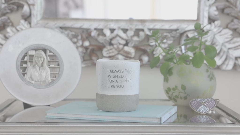 - IN-HOUSE DESIGN: The new & innovative candle offers a unique message for your loved one within the wax as time progresses. You will begin to see the black dandelion and "Amazing Teacher" sentiment after about 10 minutes. As you watch, the entire decal will appear after 50 minutes. Then, the message will hide again and reappear with each burn. The front of the candles has a simplistic "I Always Wished For A Teacher Like You" decal accompanied by a light gray dandelion.