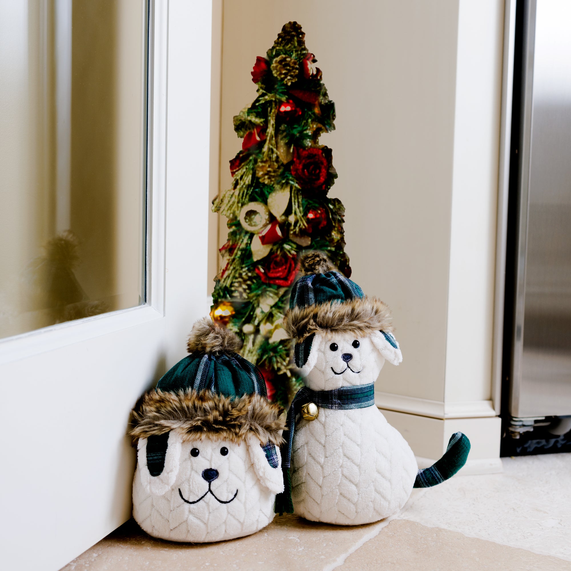 • PREMIUM QUALITY: The cat has a black embroidered face, a felt gray nose, and plastic black and gray eyes. The fluffy brown fur-trimmed winter hat sits on the cat's head. The collar features a gold metal bell. Meanwhile, the green plaid details and debossed white chevron patterns are made from 100% polyester. The interior has fluffing, weighted beads, and a felt bottom to protect floors and hardwood surfaces.