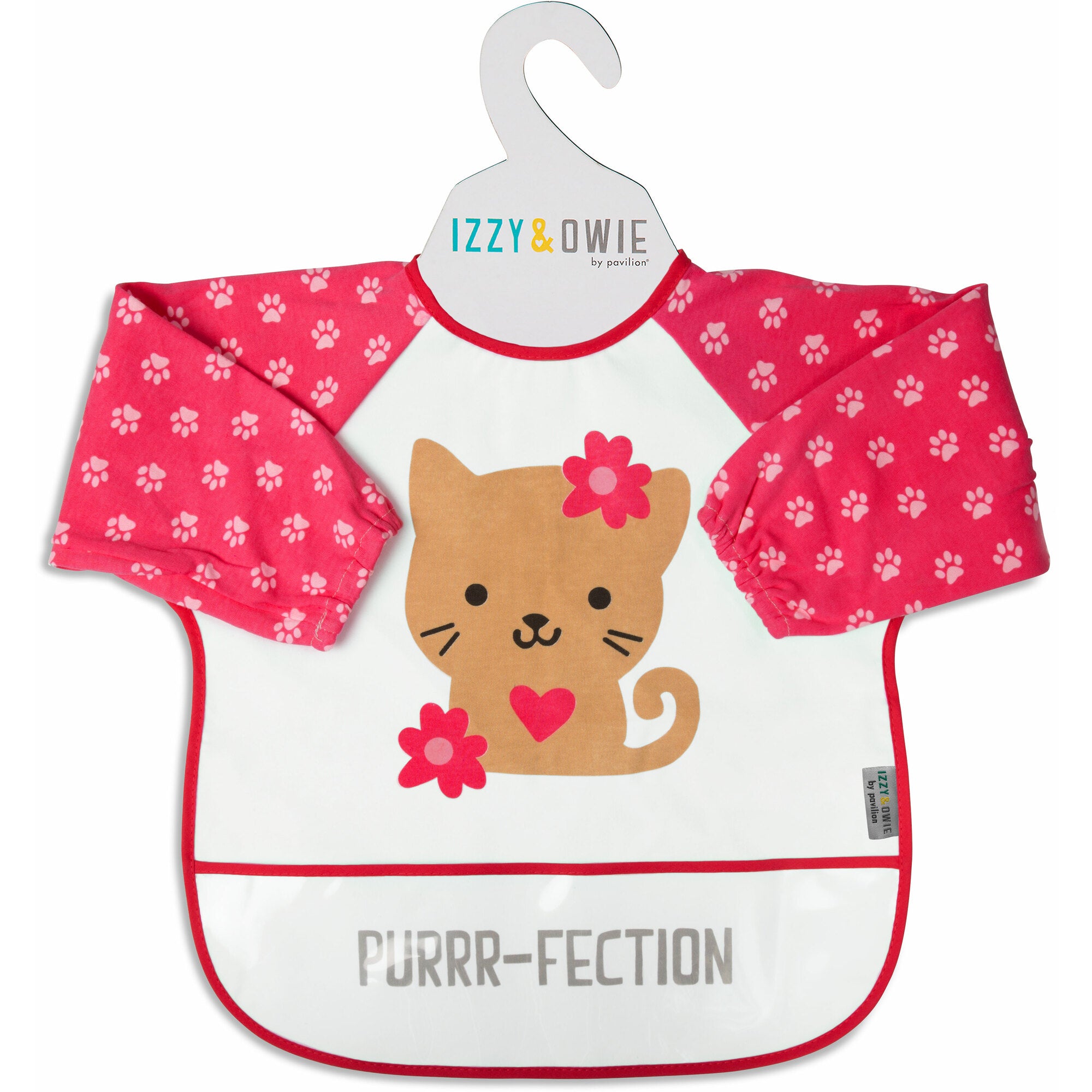 - IN-HOUSE DESIGN: "Izzy & Owie" tag is sewn into the trim alongside a sewn-in kitten image, printed "Purrr-Fection" text and paw print-patterned sleeves.