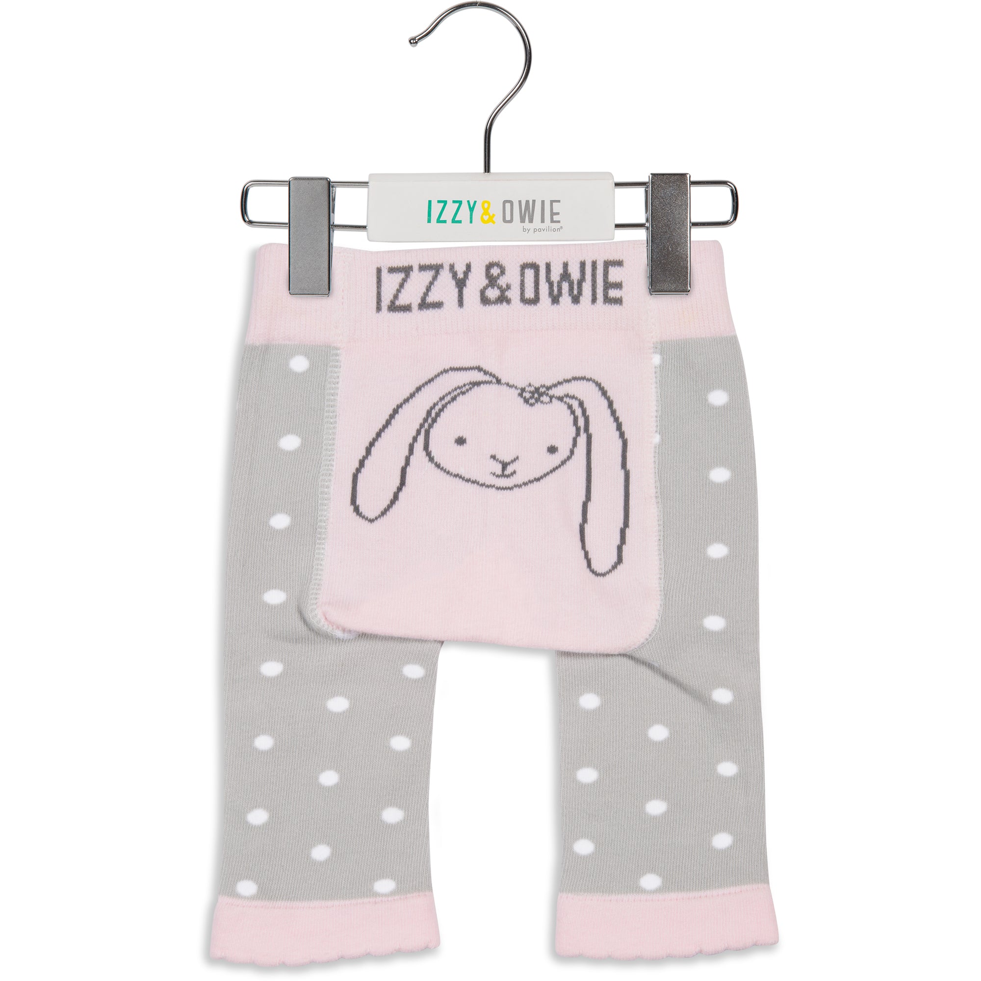 - IN-HOUSE DESIGN: "Izzy & Owie" text is sewn into the waistband, bunny image is sewn into the rear, and the dot pattern of the main material covers the rest of the leggings.