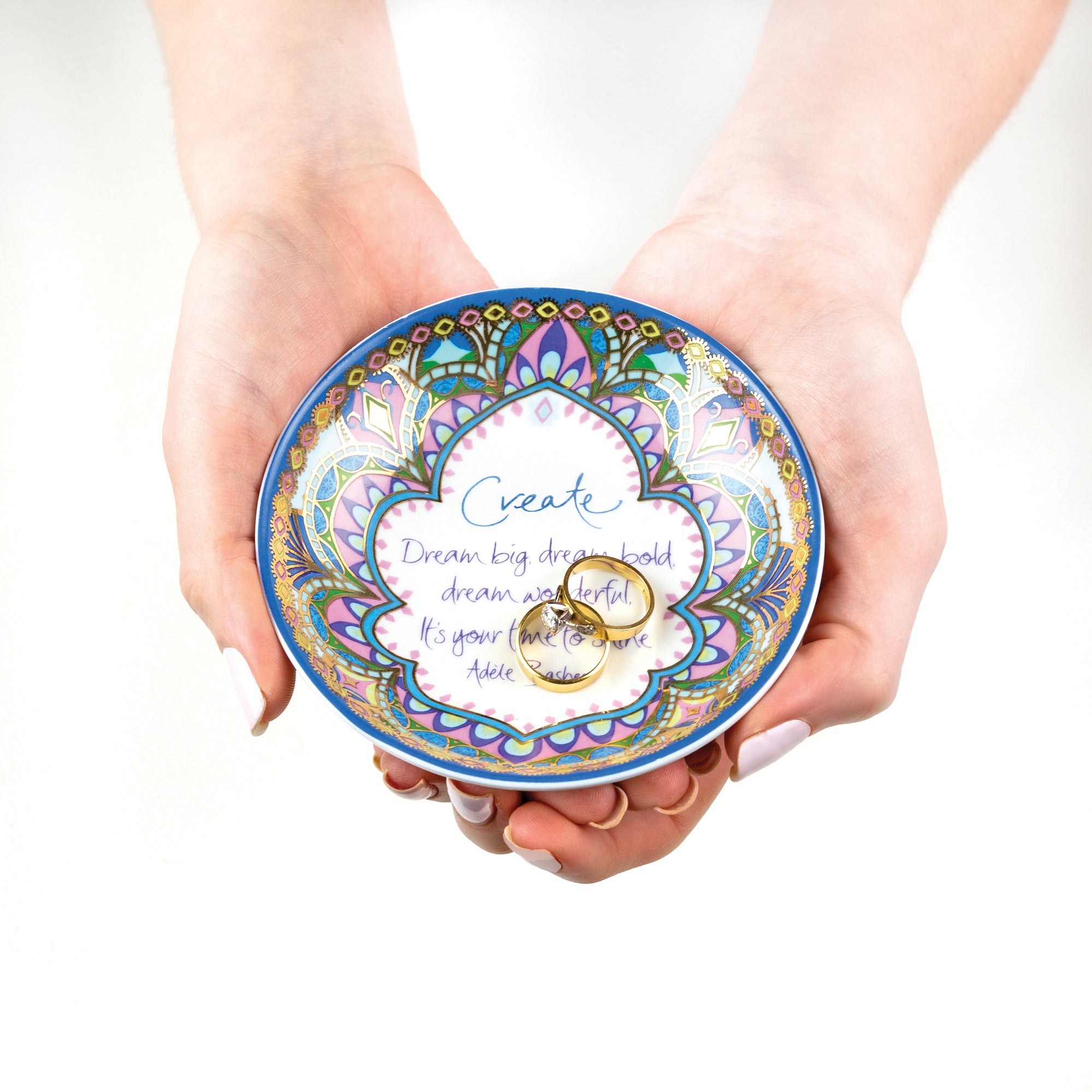 - IN-HOUSE DESIGN: Designed by Adele Basheer, "Create; Dream Big; Dream Bold; Dream Wonderful; It's Your Time To Shine" text and accompanying design decal are applied to the top of the dish.