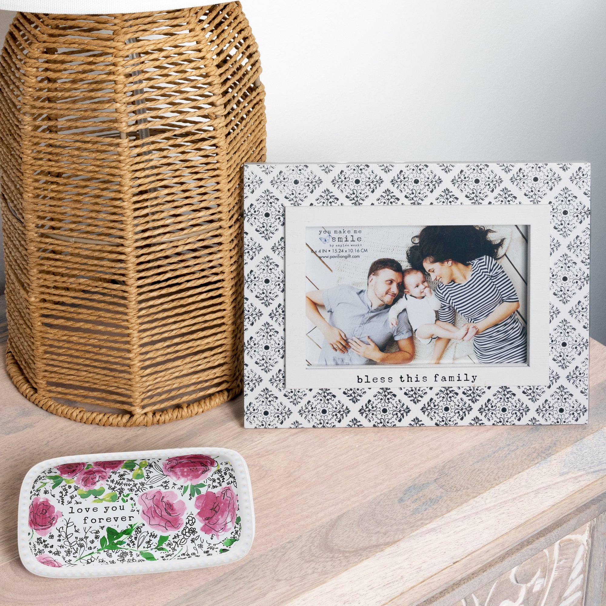 - IN-HOUSE DESIGN: The pink rose and black floral pattern watercolor image accompany a "love you forever" glossy sentiment decal on the front of this shiny white beaded tray—Prop 65 food-safe finish - artwork designed by artist Amylee Weeks, who sees the beauty in everyday life.