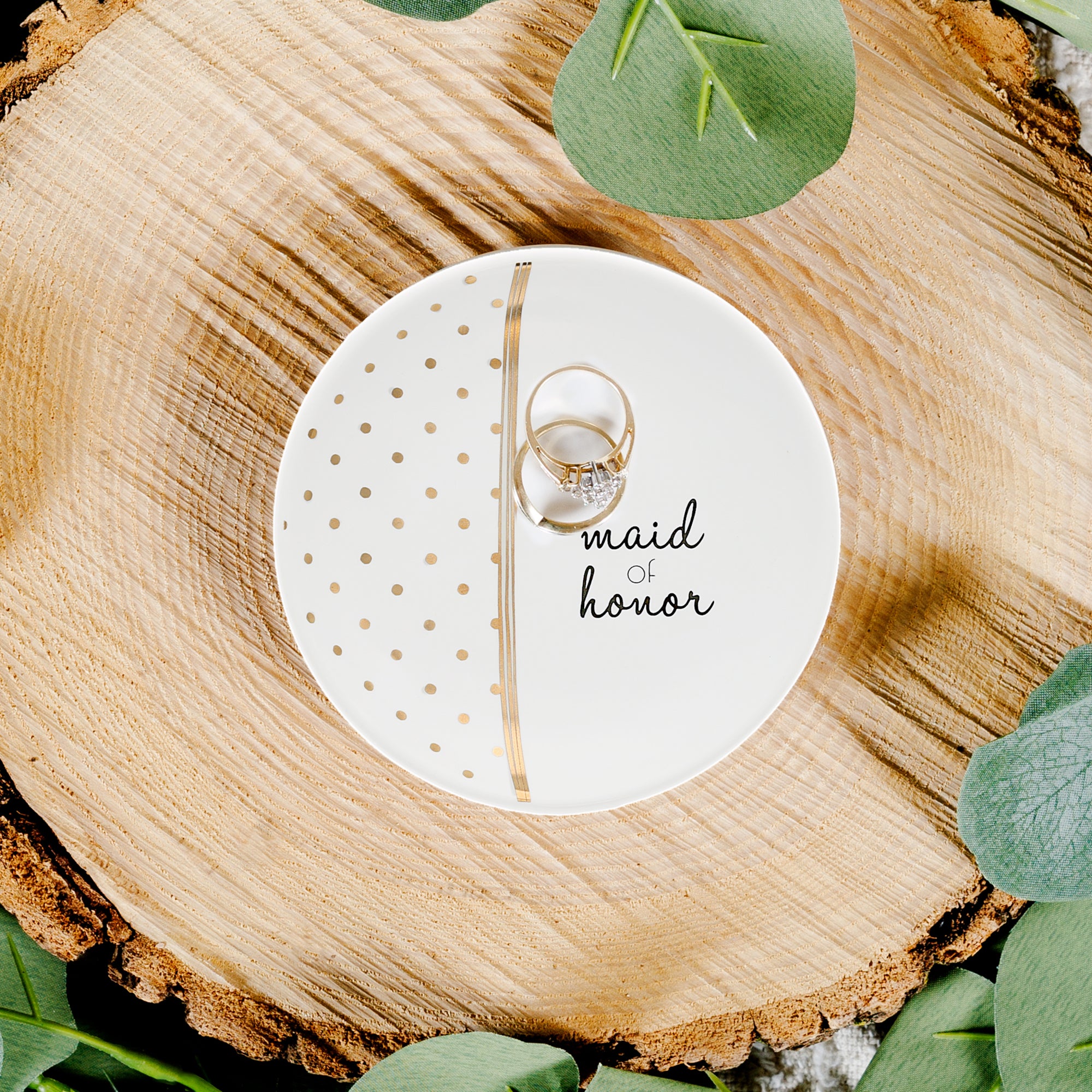 • IN-HOUSE DESIGN: The dimpled hand-made texture with gold and iridescent accents gives this dish an elegant, sophisticated, and regal feel. The “Maid of Honor” glossy decal is applied to the front side of the white pearl matte dish and is accompanied by perfectly designed gold polka dots and rope-like stripes.