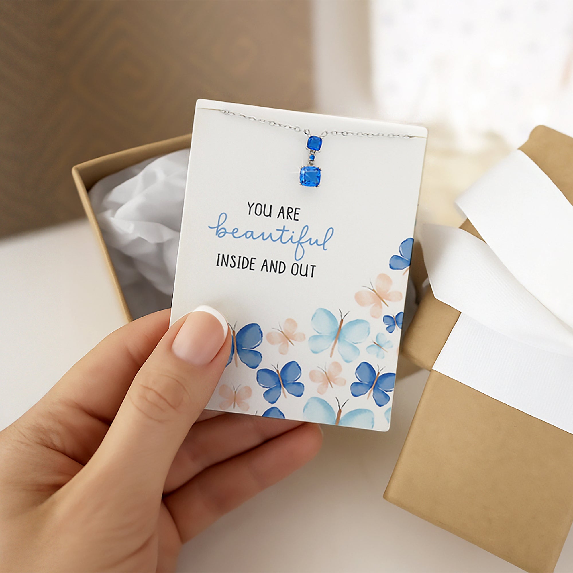 - IN-HOUSE DESIGN: The top cushion gem is 5 mm, the center round gem is 2 mm, and the largest cushion gem at the bottom is 7 mm. Each gem is set with four prongs and connecting loops. The cubic zircon gems are blue in color. The header card has a beautiful water-colored butterfly design created by Blue Chair Blessings alongside the sentiment "You Are Beautiful Inside And Out."