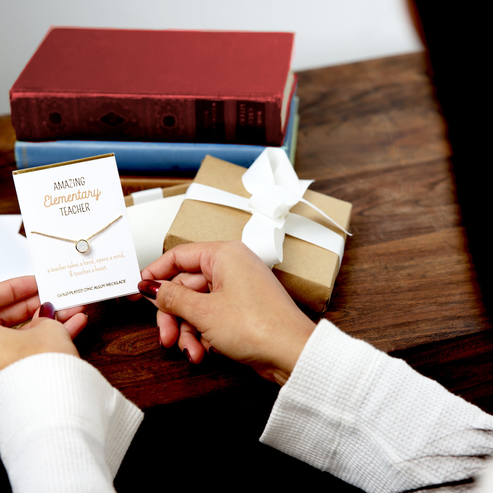 - IN-HOUSE DESIGN: The white opal cubic zirconia single round gem is 7 mm and placed inside a bezel setting. The header card has a debossed gold foiled "Amazing Elementary Teacher - A Teacher Takes A Hand, Opens A Mind, & Touches A Heart" sentiment set at the top center of the card.